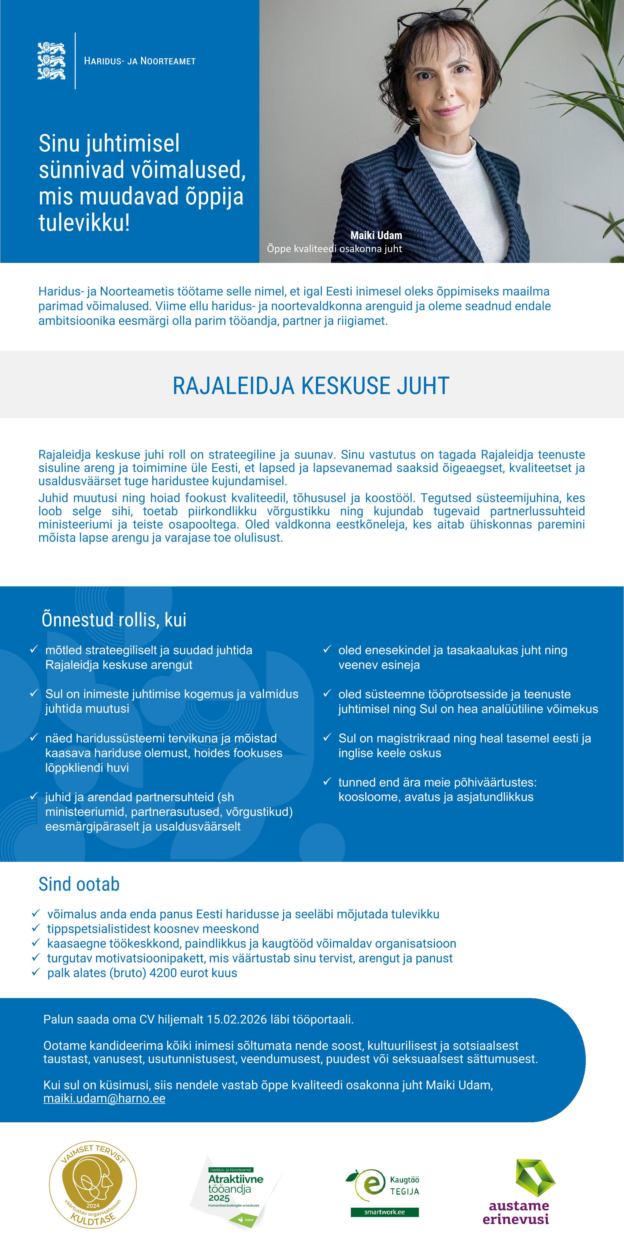 Haridus- ja Noorteametis töötame selle nimel, et igal Eesti inimesel oleks õppimiseks maailma parimad võimalused. Viime ellu haridus- ja noortevaldkonna arenguid ja oleme seadnud endale ambitsioonika eesmärgi olla parim tööandja, koostööpartner ja riigiamet.