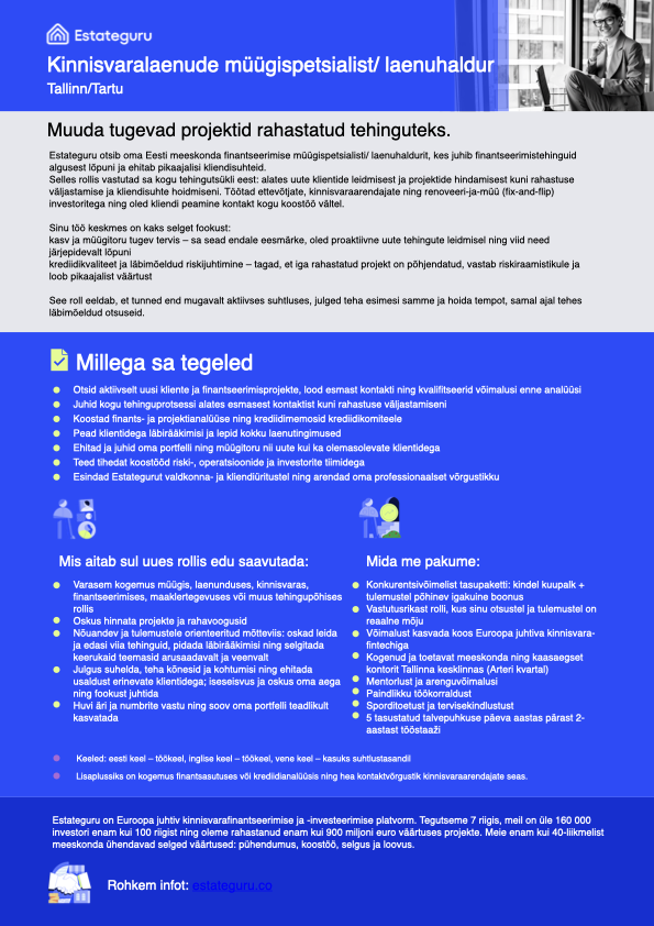 Estateguru on Euroopa juhtiv kinnisvaralaenude platvorm, mis pakub kinnisvaraga tagatud laene ettevõtetele ning atraktiivset tootlust tuhandetele investoritele. Tegutseme aktiivselt kolmes Balti riigis ning meie meeskonda kuulub 40+ pühendunud professionaali. Meie väärtused on pühendumus, koostöö, selgus ja loovus. Estateguru platvormi kaudu on tänaseks edukalt rahastatud rohkem kui 900 miljoni euro ulatuses kinnisvaraga tagatud laene, mis on aidanud ellu viia tuhandeid kinnisvaraprojekte nii Baltikumis kui ka teistes Euroopa riikides. Estategurul on Finantsinspektsiooni väljastatud tegevusluba, mis võimaldab osutada ühisrahastusteenust terves Euroopa Liidus.