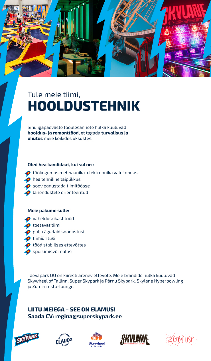 Taevapark OÜ on kiiresti arenev ettevõte. Meie brändide hulka kuuluvad Skywheel of Tallinn, Super Skypark ja Pärnu Skypark, Skylane Hyperbowling ja Zumin resto-lounge.