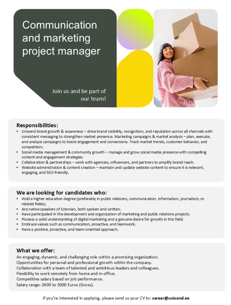 To ensure the integrity of our team at UNISEND, we may request additional information from applicants to guarantee reliability and a strong reputation. For more information about the handling of your personal data, please visit: https://unisend.ee/wp-content/uploads/2025/03/Privacy_notice_candidates_EE_EN_.pdf