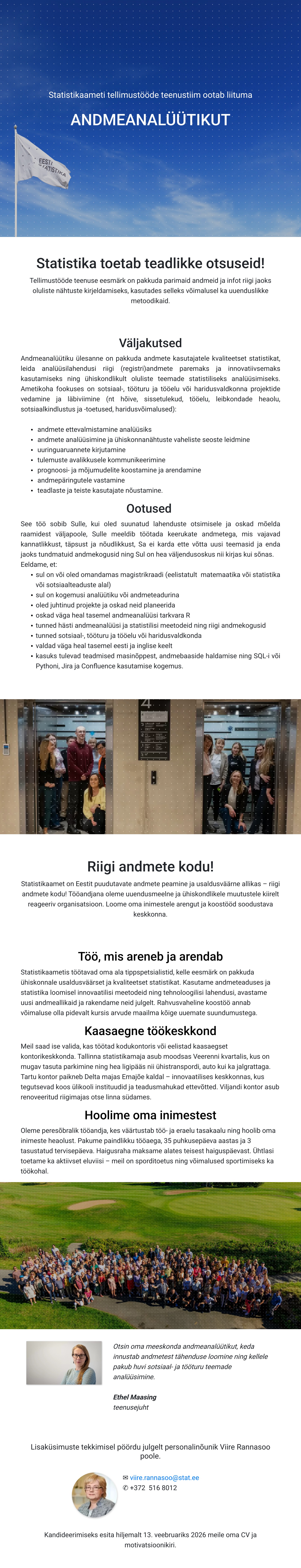 Statistikaamet on Eestit puudutavate andmete peamine ja usaldusväärne allikas riigi andmete kodu! Tööandjana oleme uuendusmeelne ja ühiskondlikele muutustele kiirelt reageeriv organisatsioon. Loome oma inimestele arengut ja koostööd soodustava keskkonna.