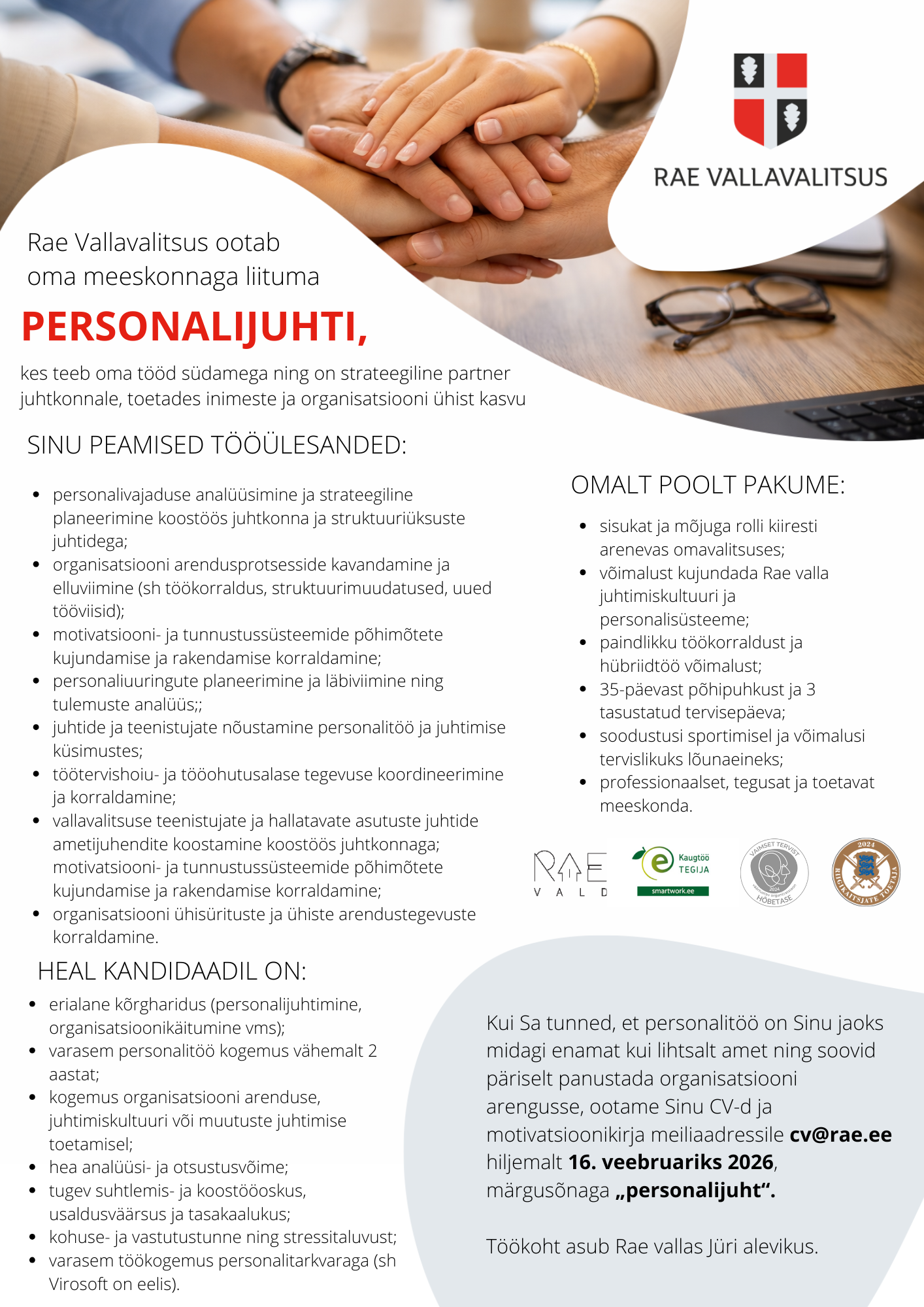 Lisahüved: Põhipuhkus 35 päeva, 3 tervisepäeva, spordikompensatsioon, tasuta parkimine, soodne tervislik lõunaeine