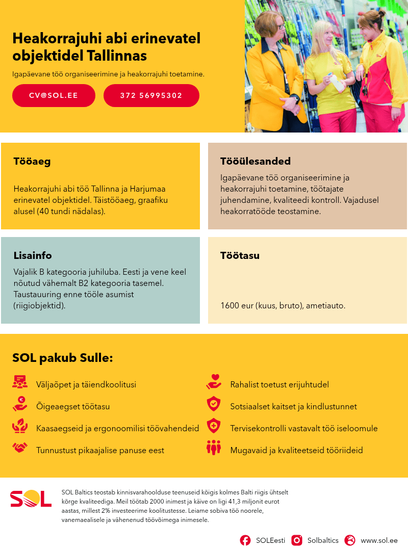 Lisahüved: Tugi ja väljaõpe heakorrajuhi poolt. Kindel tööandja SOL Baltics OÜ.
