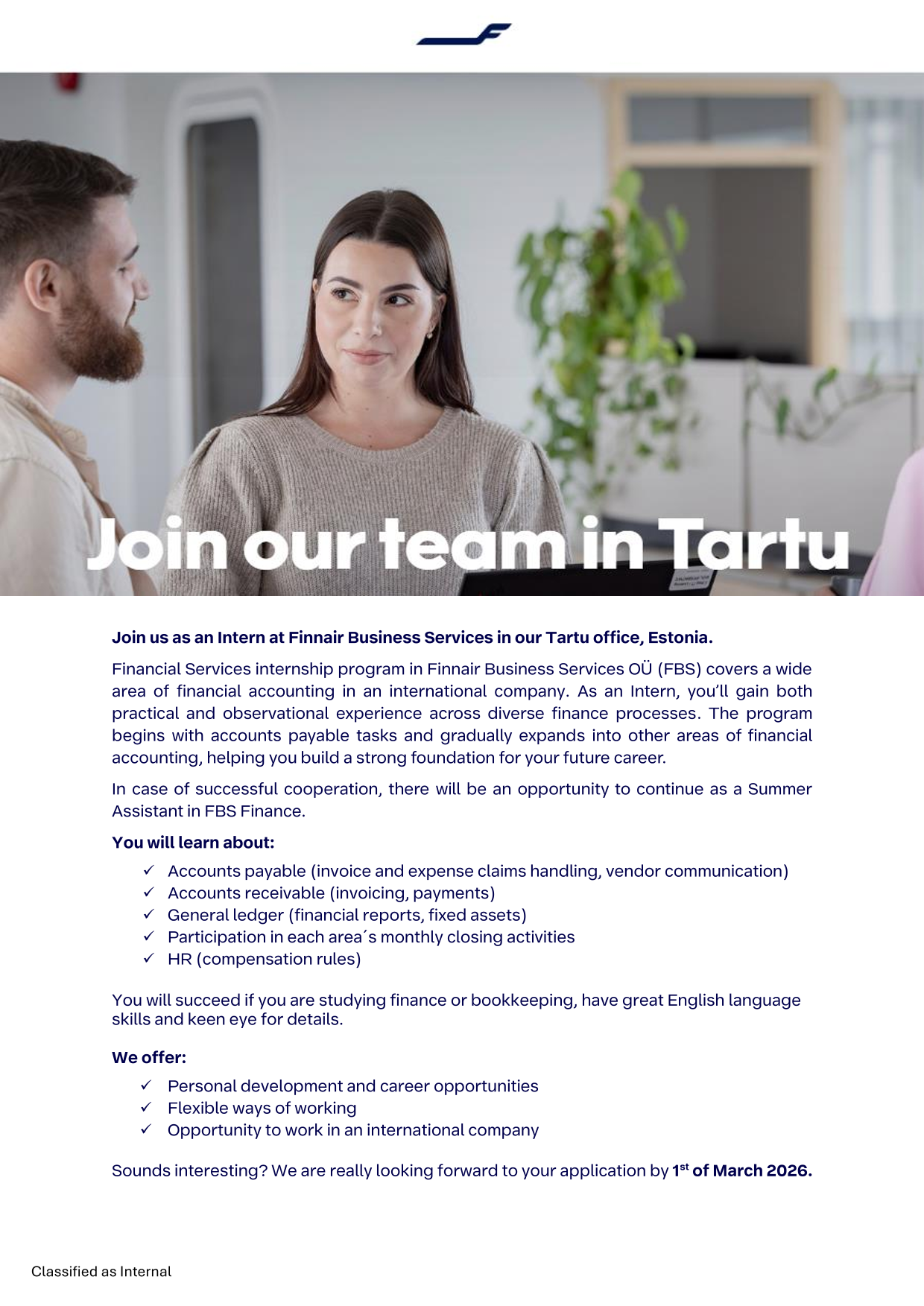 Finnair Business Services is a versatile and ambitious team of over two hundred professionals from different areas - finance, commercial, IT and more. We value simplicity, courage, commitment to care and working together. We offer personal development, interesting career opportunities in unique aviation industry, coherent approach to wellbeing and flexible ways of working.
