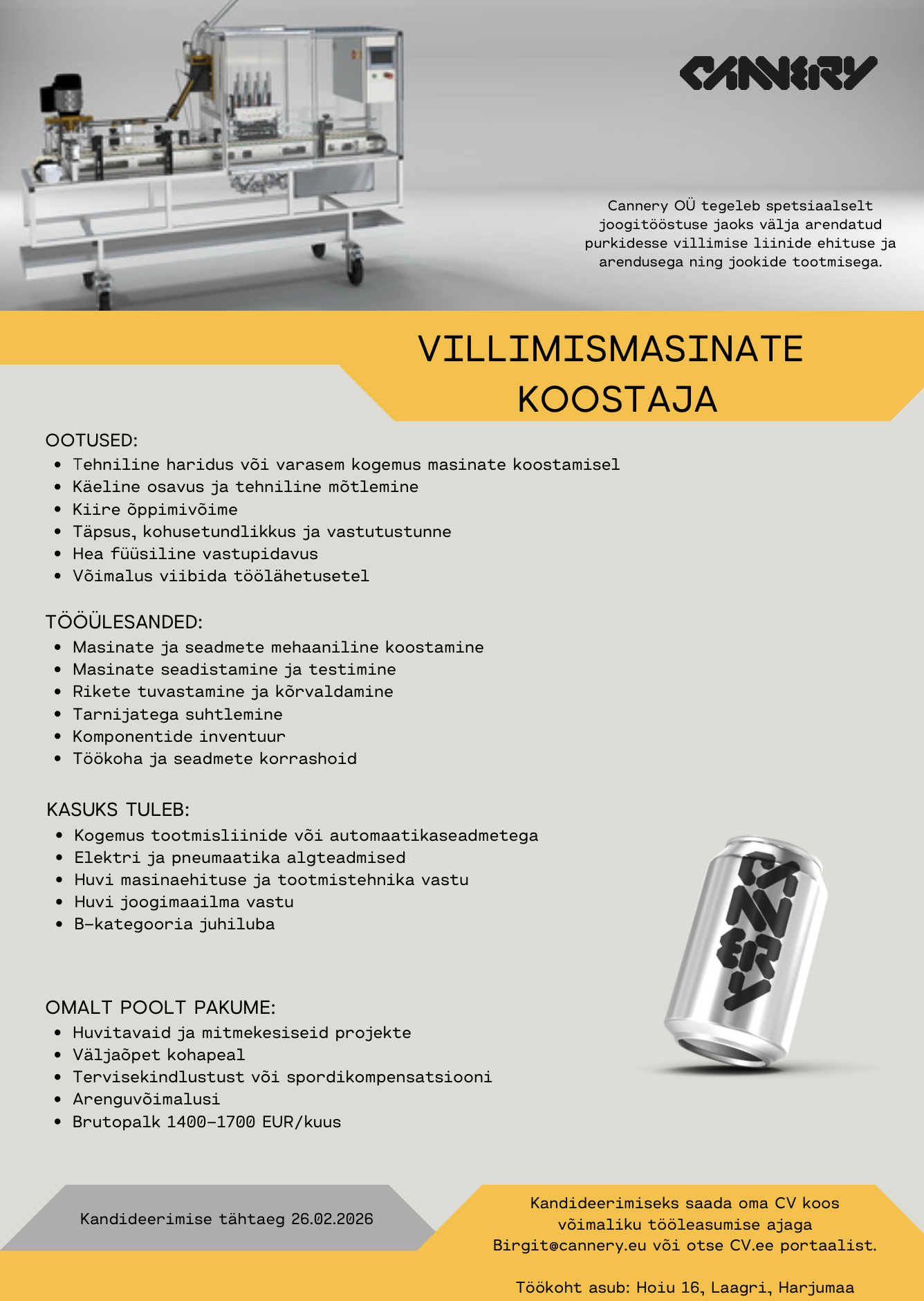 Cannery OÜ tegeleb spetsiaalselt joogitööstuse jaoks välja arendatud purkidesse villimise liinide ehituse- ja arendusega ning jookide tootmisega.