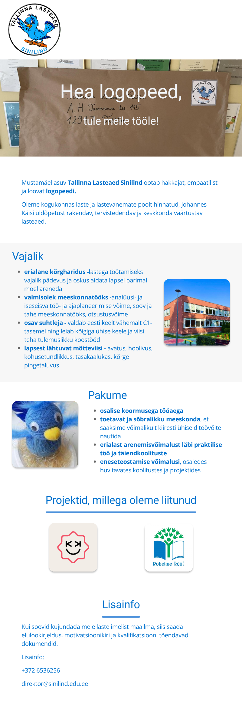 Mustamäel asuv Tallinna Lasteaed Sinilind ootab hakkajat, empaatilist ja loovat logopeedi.