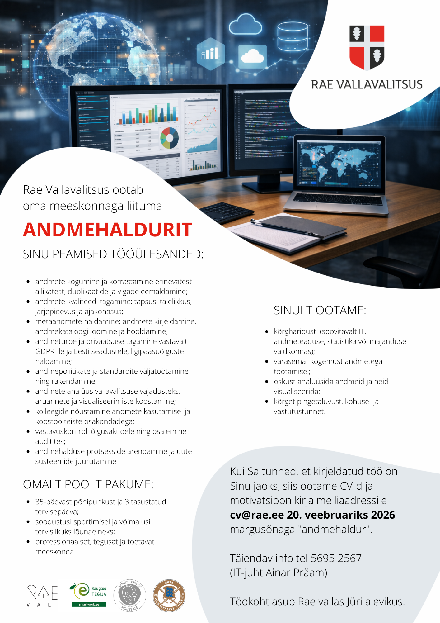 Lisahüved: Põhipuhkus 35 päeva, 3 tervisepäeva, spordikompensatsioon, tasuta parkimine, soodne tervislik lõunaeine