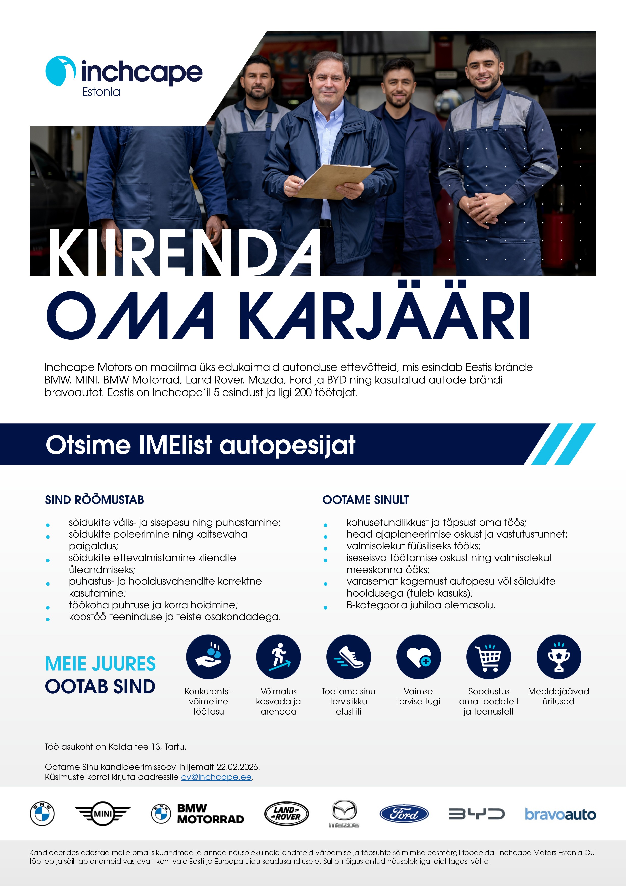Inchcape Motors on üle 170-aastase ajalooga rahvusvaheline börsi ettevõte. Inchcape tegutseb ligi 50 riigis üle maailma nii autode maaletooja kui edasimüüjana. Grupis töötab kokku üle 20 000 inimese. Inchcape Motors Estonia sai alguse 2004. aastal Mazda brändiga. Hetkel esindab ettevõte Eestis brände Land Rover, Mazda, BMW, Mini ja BMW Motorrad, Ford ja BYD ning kasutatud autode brändi bravoauto. Meie tegevusvaldkondadeks on uute ja kasutatud autode ning varuosade müük, autode hooldus ja remont. Meie esindused asuvad Tallinnas, Laagris, Peetris ja Tartus. Meie Eesti meeskonnas on üle 200 imelise liikme.