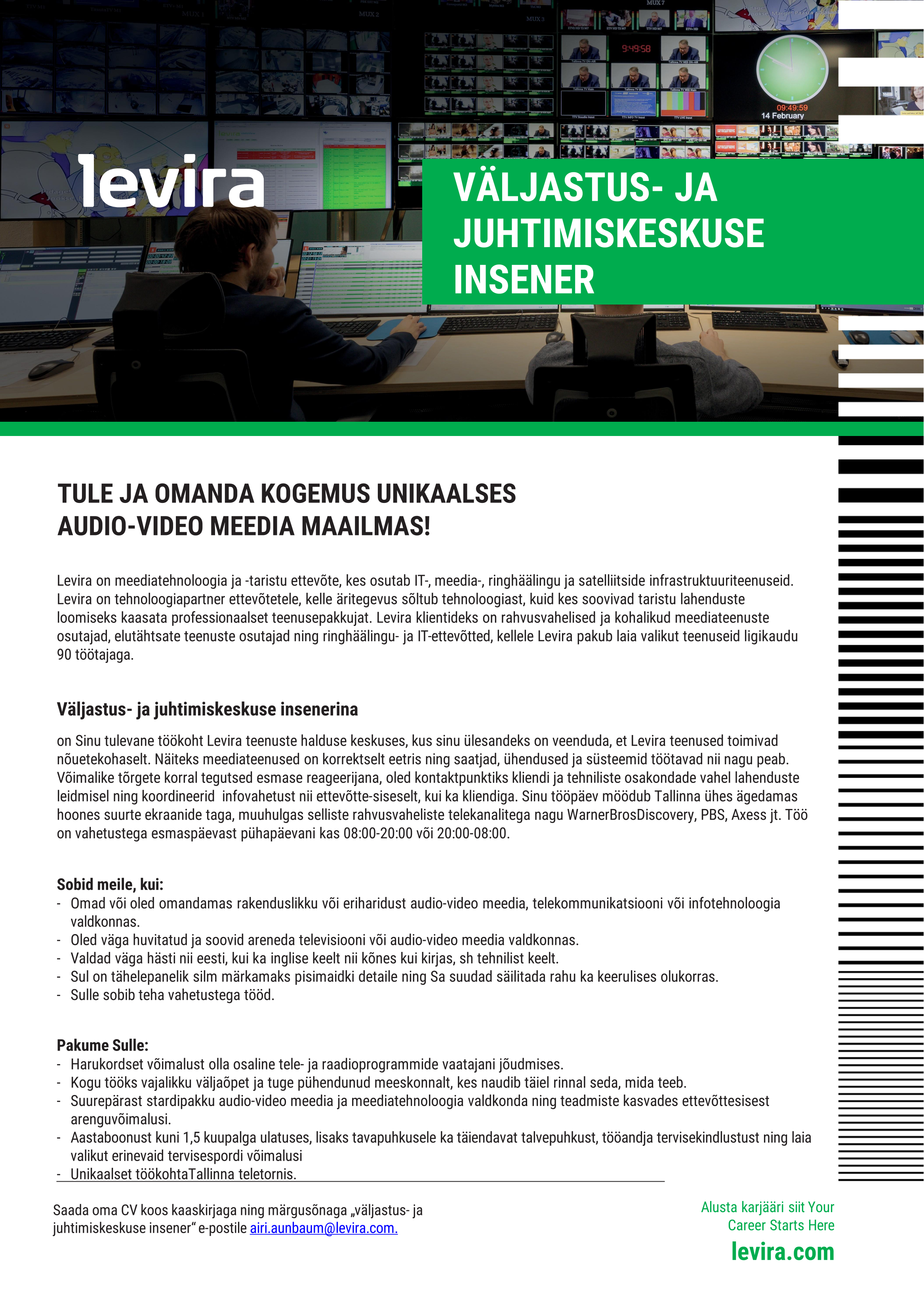 Eestis oleme olnud meediatööstusele pikaajaline ja usaldusväärne partner audiovisuaalse sisu maapealse ringhäälingu vallas. Levira opereerib ja arendab Eesti maapealse digitaaltelevisiooni võrke ning on Eesti suurim FM raadioprogrammide edastaja.