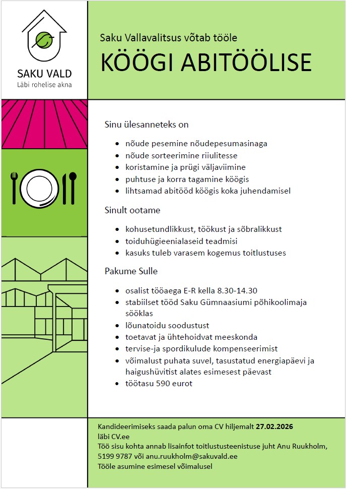 • stabiilset tööd Saku Gümnaasiumi põhikoolimaja sööklas