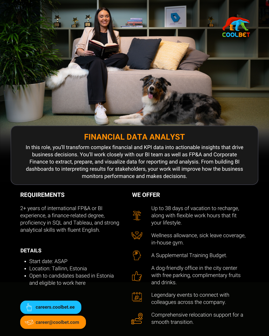 - Prefer English? Please find the ad in English here: https://careers.coolbet.ee/jobs/7193030-financial-data-analyst