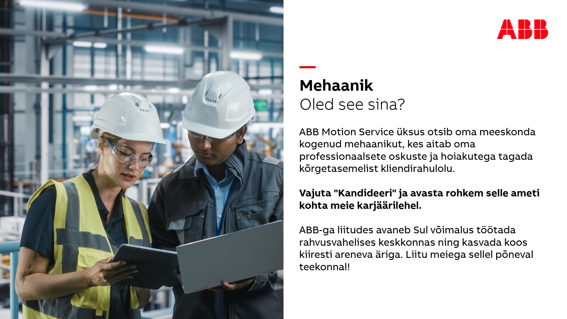 ABB on elektrifitseerimise ja automatiseerimise valdkonnas ülemaailmne tehnoloogialiider. Meie eesmärk on võimaldada jätkusuutlikumat ja ressursitõhusamat tulevikku. Ühendades oma inseneri- ja digitaliseerimisalased teadmised, aitame tööstusharudel toimida suure jõudlusega, muutudes samal ajal tõhusamaks, produktiivsemaks ja jätkusuutlikumaks, et nad edestaksid konkurente. Me nimetame seda: "Engineered to Outrun." Meil on üle maailma umbes 110 000 töötajat ja meie ajalugu ulatub enam kui 140 aasta taha.
