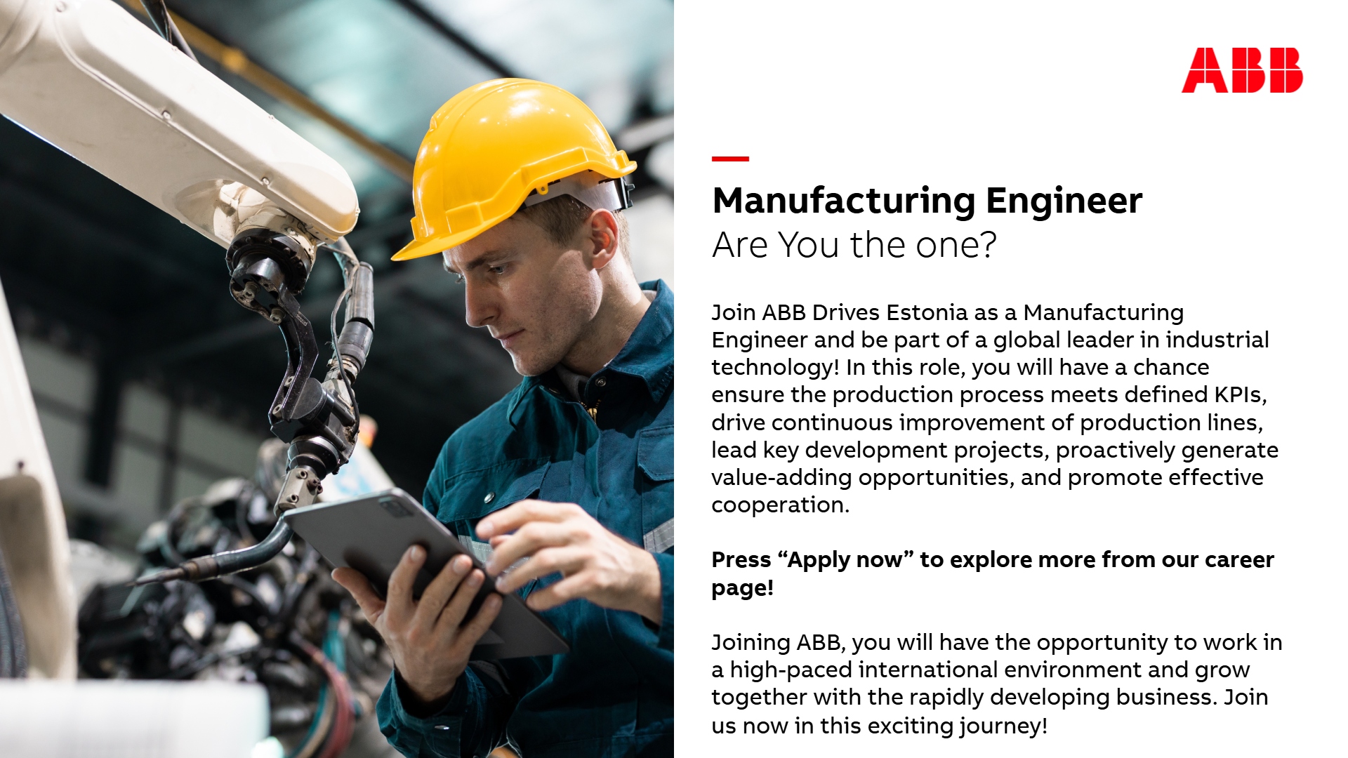 ABB on elektrifitseerimise ja automatiseerimise valdkonnas ülemaailmne tehnoloogialiider. Meie eesmärk on võimaldada jätkusuutlikumat ja ressursitõhusamat tulevikku. Ühendades oma inseneri- ja digitaliseerimisalased teadmised, aitame tööstusharudel toimida suure jõudlusega, muutudes samal ajal tõhusamaks, produktiivsemaks ja jätkusuutlikumaks, et nad edestaksid konkurente. Me nimetame seda: "Engineered to Outrun." Meil on üle maailma umbes 110 000 töötajat ja meie ajalugu ulatub enam kui 140 aasta taha.