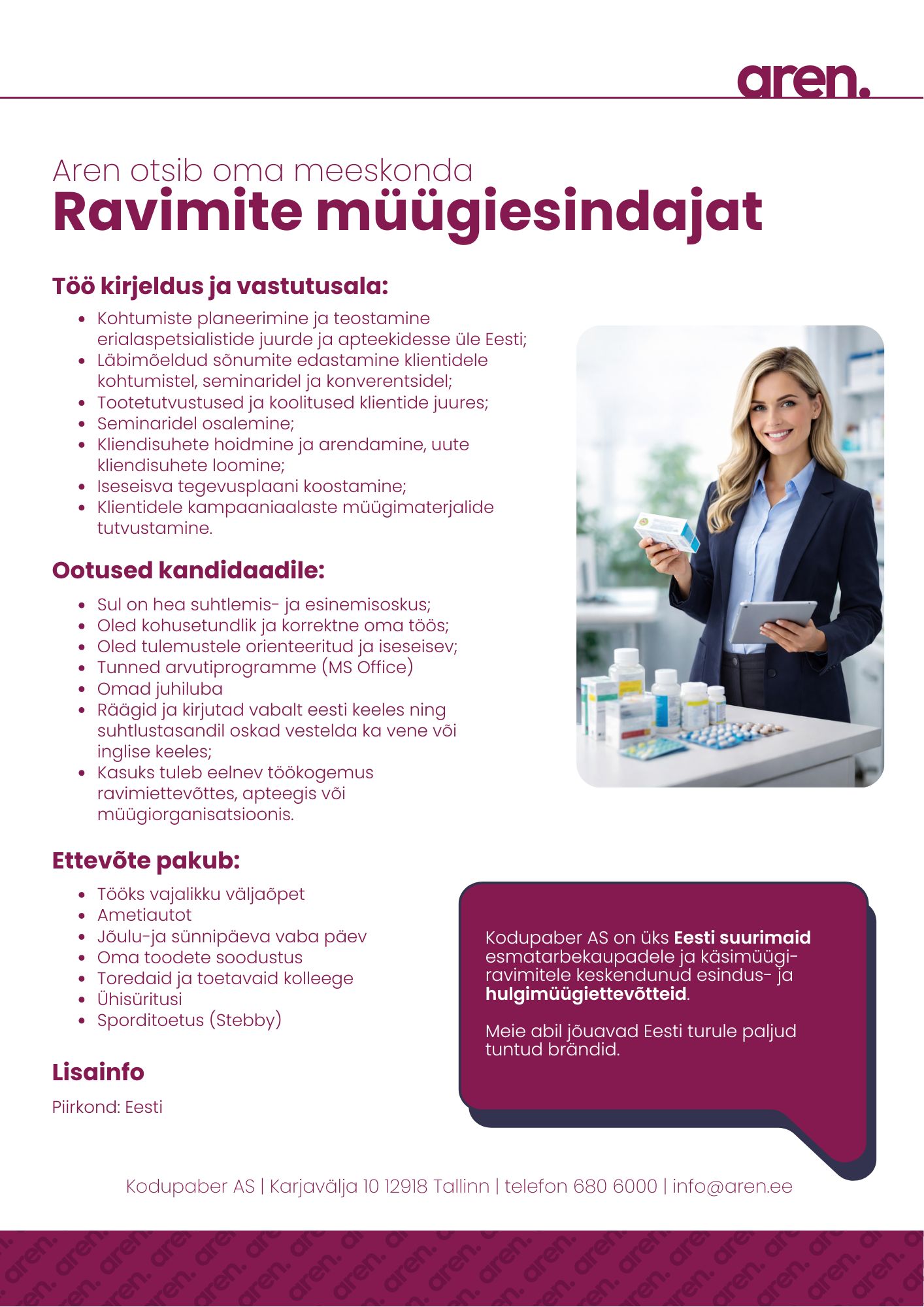 Aren Sinu usaldusväärne terviklahenduse pakkuja aastast 1993!Kindel partner müügi, logistika, puhastustehnika ja ravimihulgimüügi valdkonnas.Meie professionaalne meeskond, üle 30-aastane kogemus ja kogu Eestit kattev tarne- ning hooldusvõrgustik tagavad sujuva ja usaldusväärse teenuse. Brändiesindus ja distributsioon