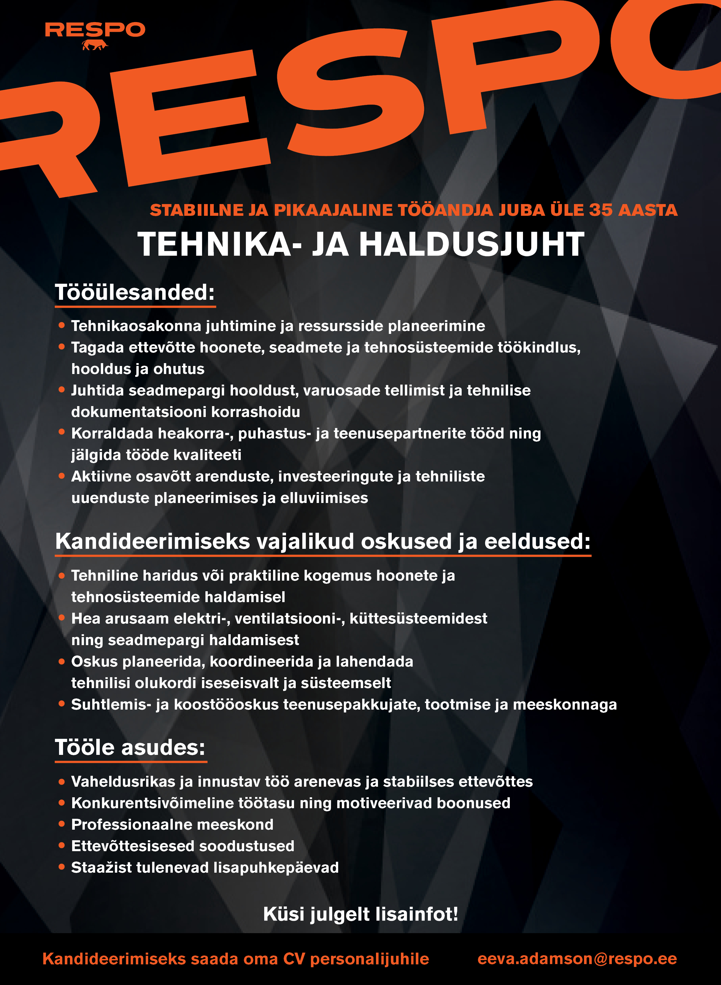 - Tehniline haridus või praktiline kogemus hoonete ja tehnosüsteemide haldamisel