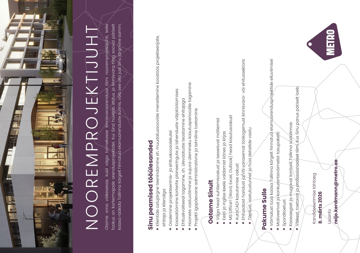 Metro on juhtiv kinnisvaraettevõte, mis on pühendunud moodsa ja kestliku elukeskkonna loomisele, vastates tänapäeva inimeste vajadustele ning olles alati sammukese ajast ees.
