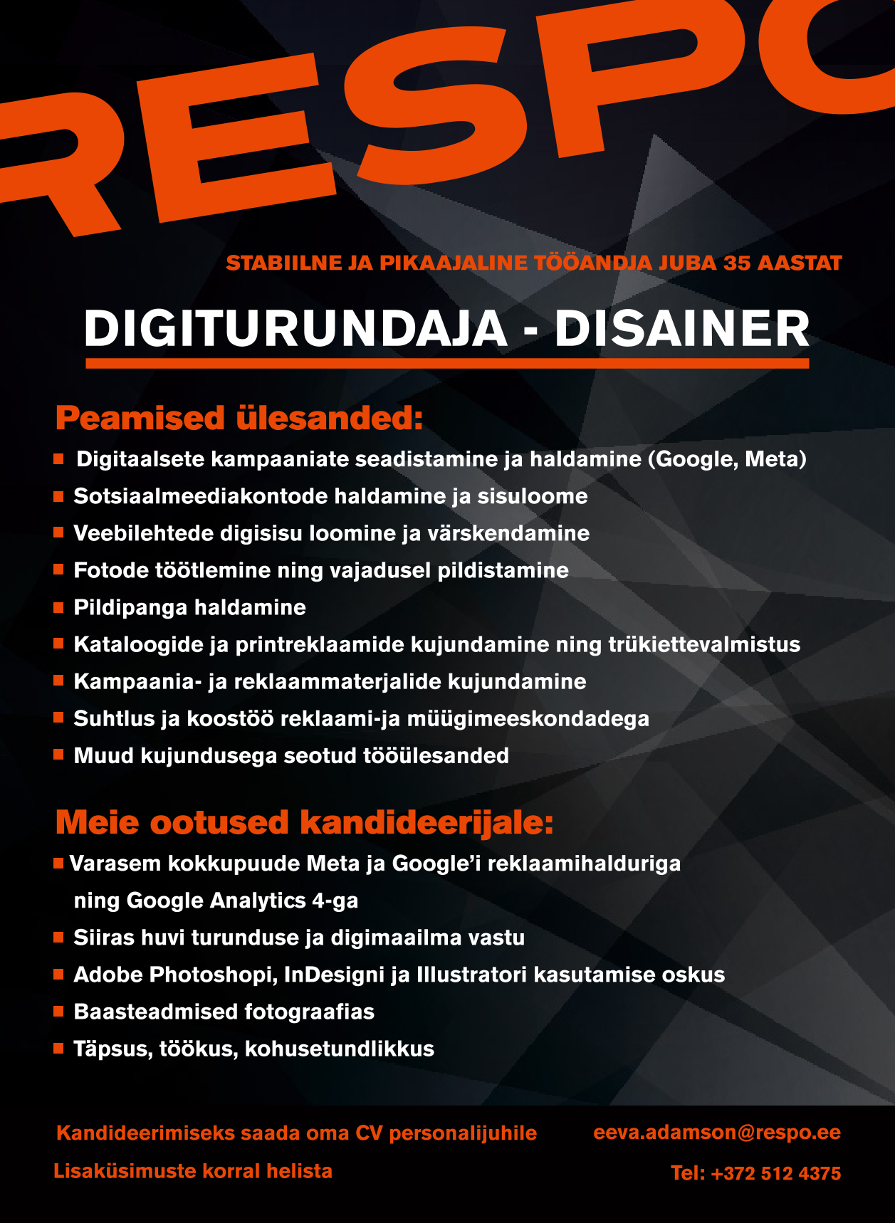 - Adobe Photoshopi, InDesigni ja Illustratori kasutamise oskus