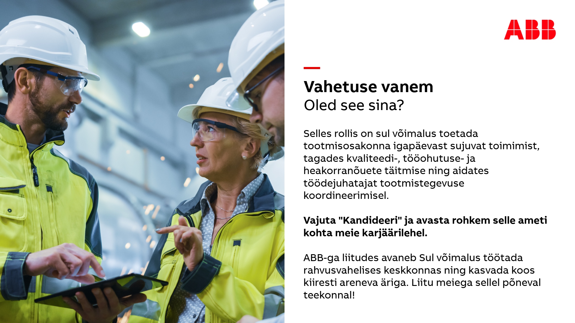 ABB on elektrifitseerimise ja automatiseerimise valdkonnas ülemaailmne tehnoloogialiider. Meie eesmärk on võimaldada jätkusuutlikumat ja ressursitõhusamat tulevikku. Ühendades oma inseneri- ja digitaliseerimisalased teadmised, aitame tööstusharudel toimida suure jõudlusega, muutudes samal ajal tõhusamaks, produktiivsemaks ja jätkusuutlikumaks, et nad edestaksid konkurente. Me nimetame seda: "Engineered to Outrun." Meil on üle maailma umbes 110 000 töötajat ja meie ajalugu ulatub enam kui 140 aasta taha.