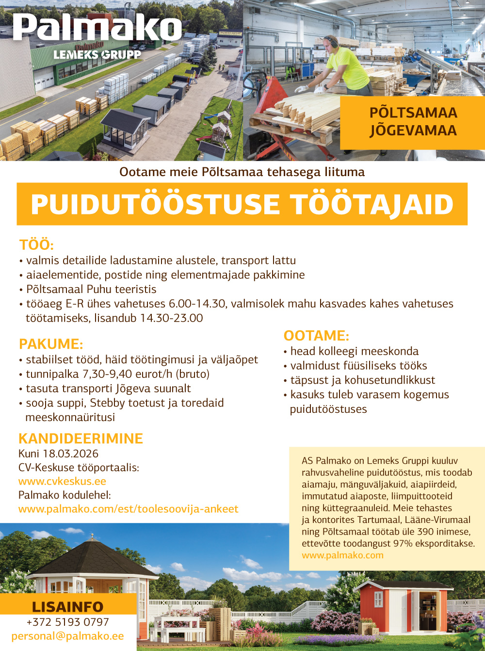 AS Palmako on Lemeks Gruppi kuuluv rahvusvaheline puidutööstus, mis toodab aiamaju, mänguväljakuid, aiapiirdeid, immutatud aiaposte, liimpuittooteid ning küttegraanuleid. Meie tehastes ja kontorites Tartumaal, Lääne-Virumaal ning Põltsamaal töötab üle 380 inimese, ettevõtte toodangust 97% eksporditakse.www.palmako.com