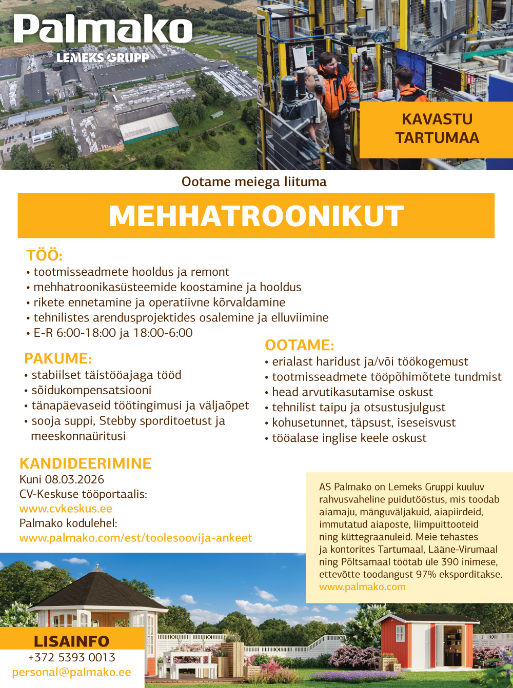 AS Palmako on Lemeks Gruppi kuuluv rahvusvaheline puidutööstus, mis toodab aiamaju, mänguväljakuid, aiapiirdeid, immutatud aiaposte, liimpuittooteid ning küttegraanuleid. Meie tehastes ja kontorites Tartumaal, Lääne-Virumaal ning Põltsamaal töötab üle 380 inimese, ettevõtte toodangust 97% eksporditakse.www.palmako.com