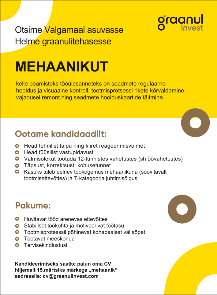 - kasuks tuleb eelnev töökogemus mehaanikuna (soovitavalt tootmisettevõttes)