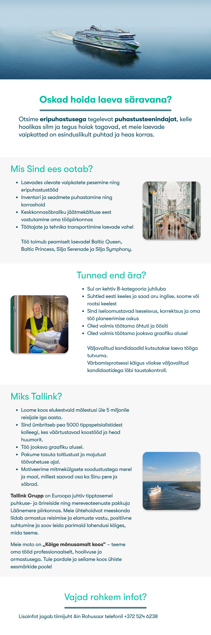 Tallink on Läänemere suurim ja edukaim reisilaevandusfirma. Tallink on Eesti hingega põhjamaine ettevõte, mis on rahvusvahelise kontsernina esindatud Eestis, Soomes, Rootsis, Lätis ja Saksamaal. Laevanduse kõrval on meil aastakümnete pikkune kogemus nii hotellinduses, jaekaubanduses, meelelahutuses, restoraniäris ja muuski. Äritegevuses seame esikohale jätkusuutlikkuse ning peame oluliseks mööndusteta kvaliteeti.