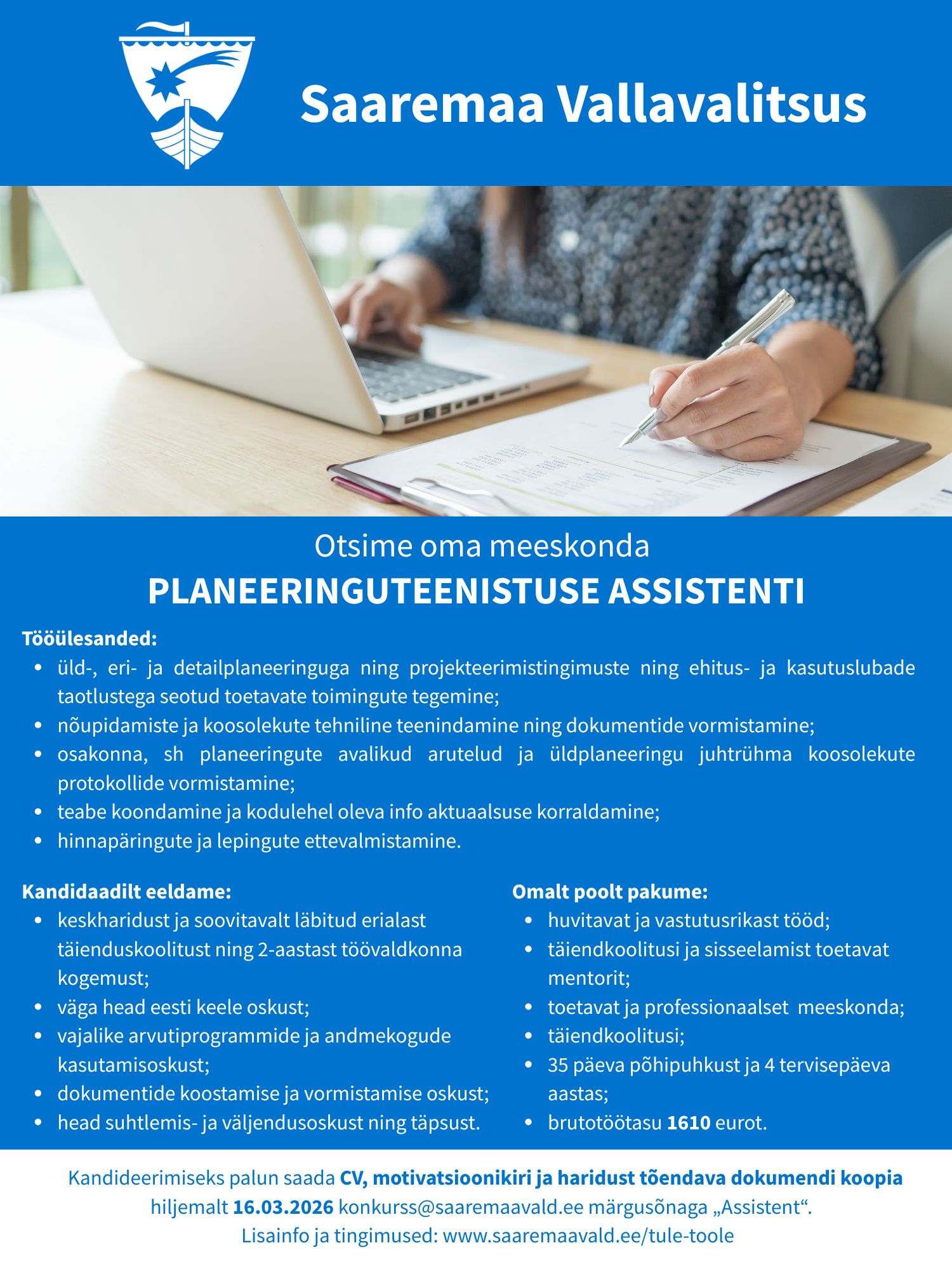 Saaremaa vald on Eesti suurim kohalik omavalitsus. Meiega liitudes annad panuse edendamaks elu Saaremaal. Tule, tee ja saa osa oma tööviljadest, sest iga töölõik on valla kui ka maakonna elu hüvanguks oluline ning tulemus kohe märgata. Anna panus nii Saaremaa Vallavalitsuse kui ka Saaremaa elanike heaks!