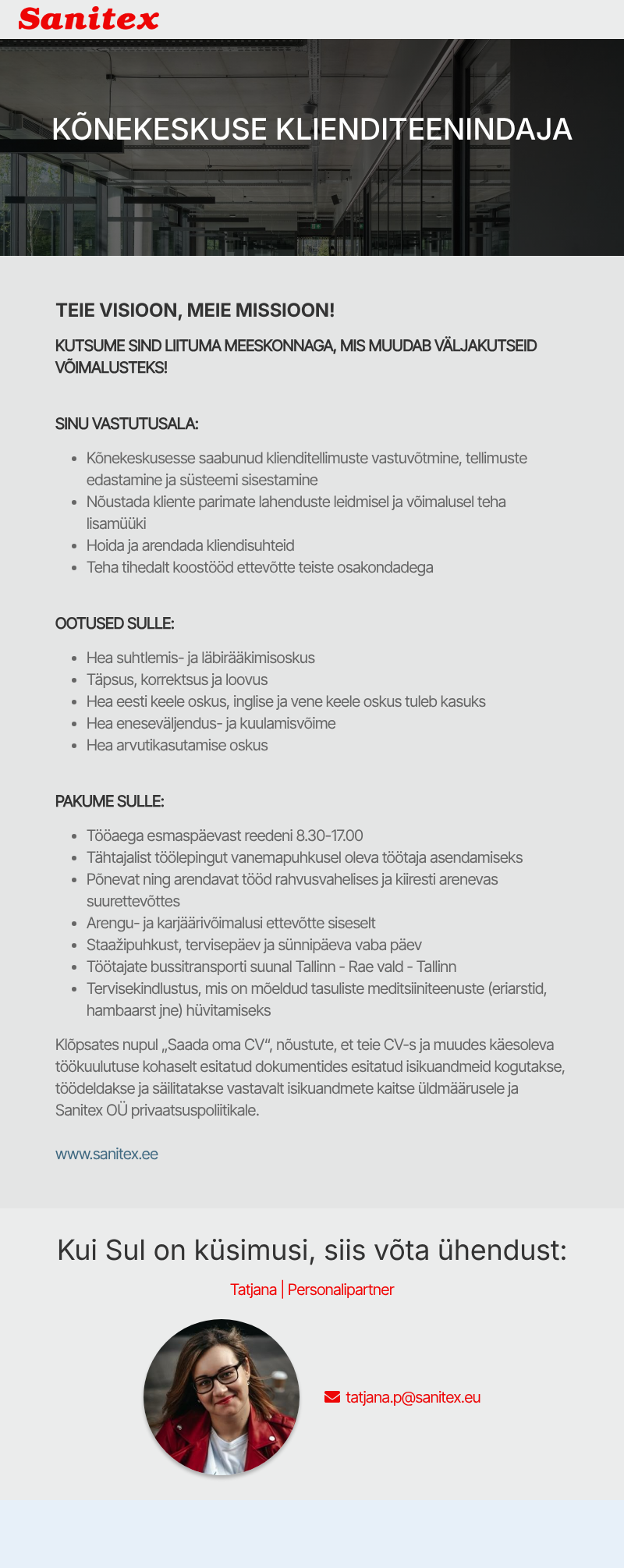 Lisahüved: - Stabiilne töökoht rahvusvahelises ettevõttes - Hea sisekliima ja toetavad kolleegid