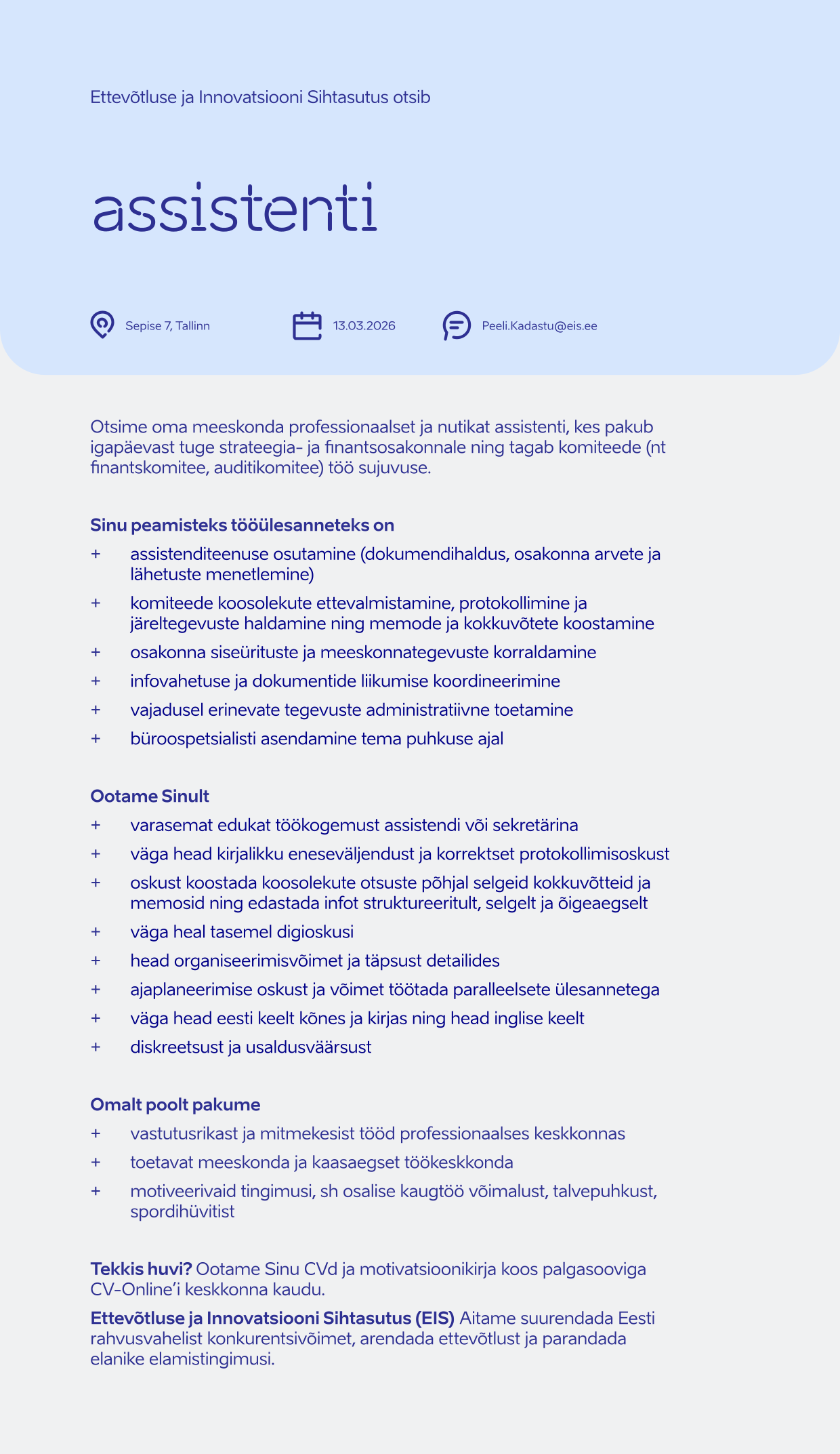 Ettevõtluse ja Innovatsiooni Sihtasutus (EIS) on riigi poolt asututatud sihtasutus, mille eesmärk on suurendada Eesti rahvusvahelist konkurentsivõimet, arendada ettevõtlust ja elukeskkonda. Aitame ettevõtetel kasvada, laieneda välisturgudele ning toetame tehnoloogiavaldkonna arengut. Meie eesmärk on muuta Eesti atraktiivseks paigaks nii ettevõtetele, tippspetsialistidele kui ka väliskülalistele. Eraisikuid toetame elamistingimuste parandamisel.