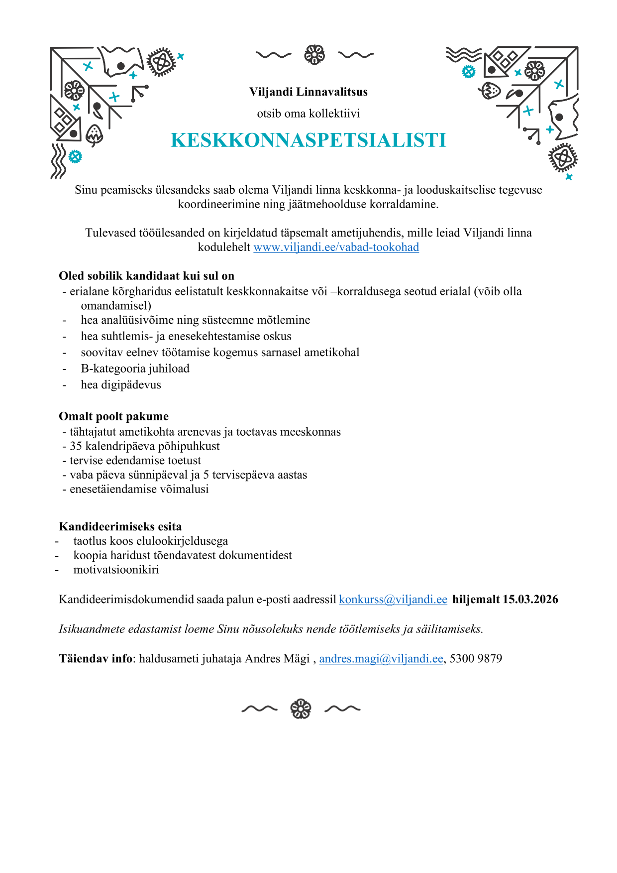 Sinu peamiseks ülesandeks saab olema Viljandi linna keskkonna- ja looduskaitselise tegevuse koordineerimine ning jäätmehoolduse korraldamine.