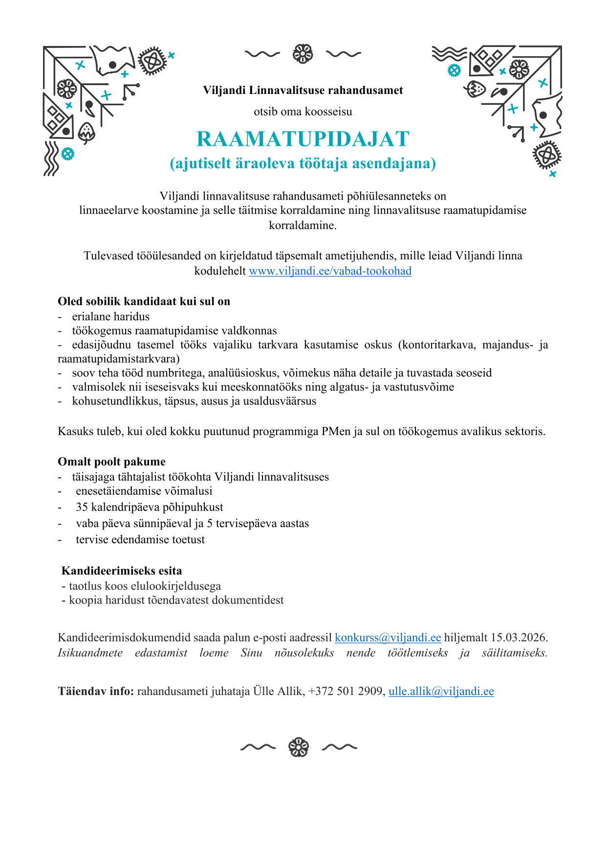 - täisajaga tähtajalist töökohta Viljandi linnavalitsuses