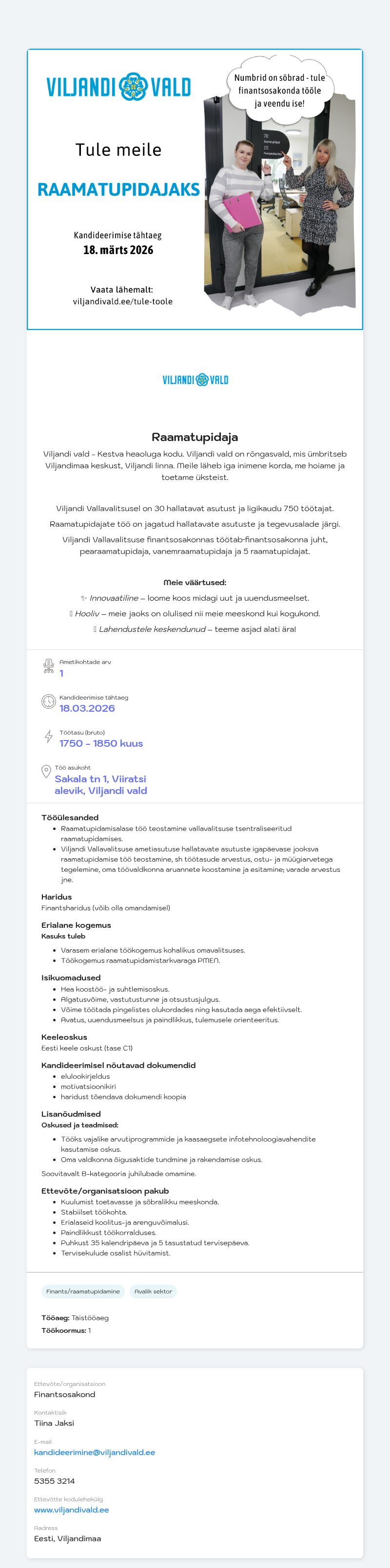 Viljandi Vallavalitsuse finantsosakonnas töötab finantsosakonna juht, pearaamatupidaja, vanemraamatupidaja ja 5 raamatupidajat.