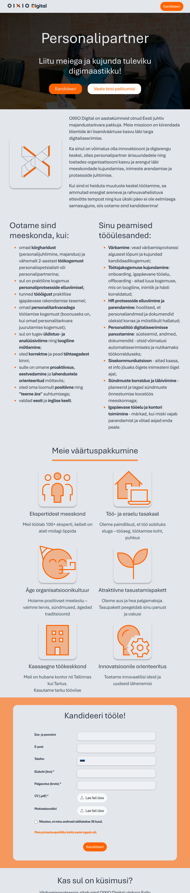 OIXIO Digital’i kõige olulisem vara on meie inimesed, kes teevad oma tööd südamega. Uued väljakutsed on need, mis meid käivitavad ja seeläbi annavad võimaluse korda saata midagi olulist. Lisaks mõtleme alati, kas on võimalik teha asju paremini, alati ootuseid ületades ja mitte leppides keskpärasusega.