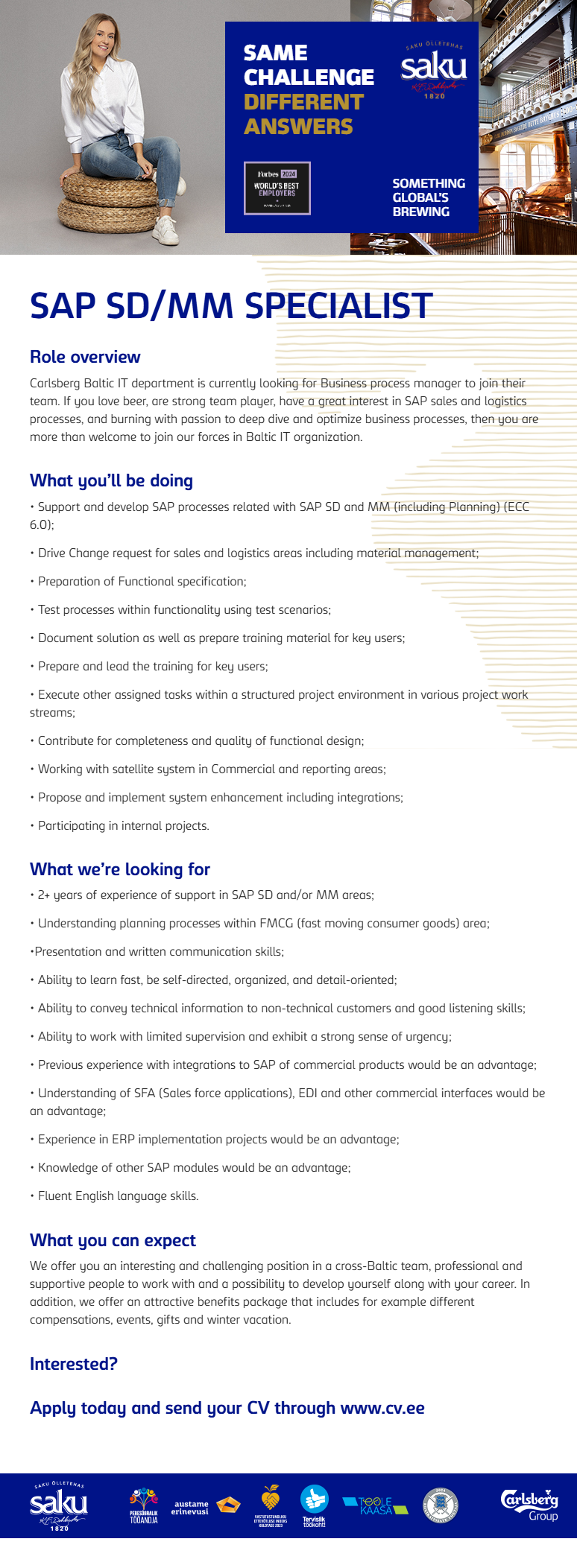 Saku Õlletehase AS-is, Carlsbergi grupi Baltikumi üksuses, ootab sind ees rahvusvahelise joogitööstuse põnev maailm. Siin töötavad oma ala tipptegijad, kes igapäevaselt pingutavad selle nimel, et meie tooted oleksid laitmatu kvaliteediga ja pakuksid unikaalseid maitseelamusi. Meie jaoks on oluline mõelda paremale tänasele ja homsele.