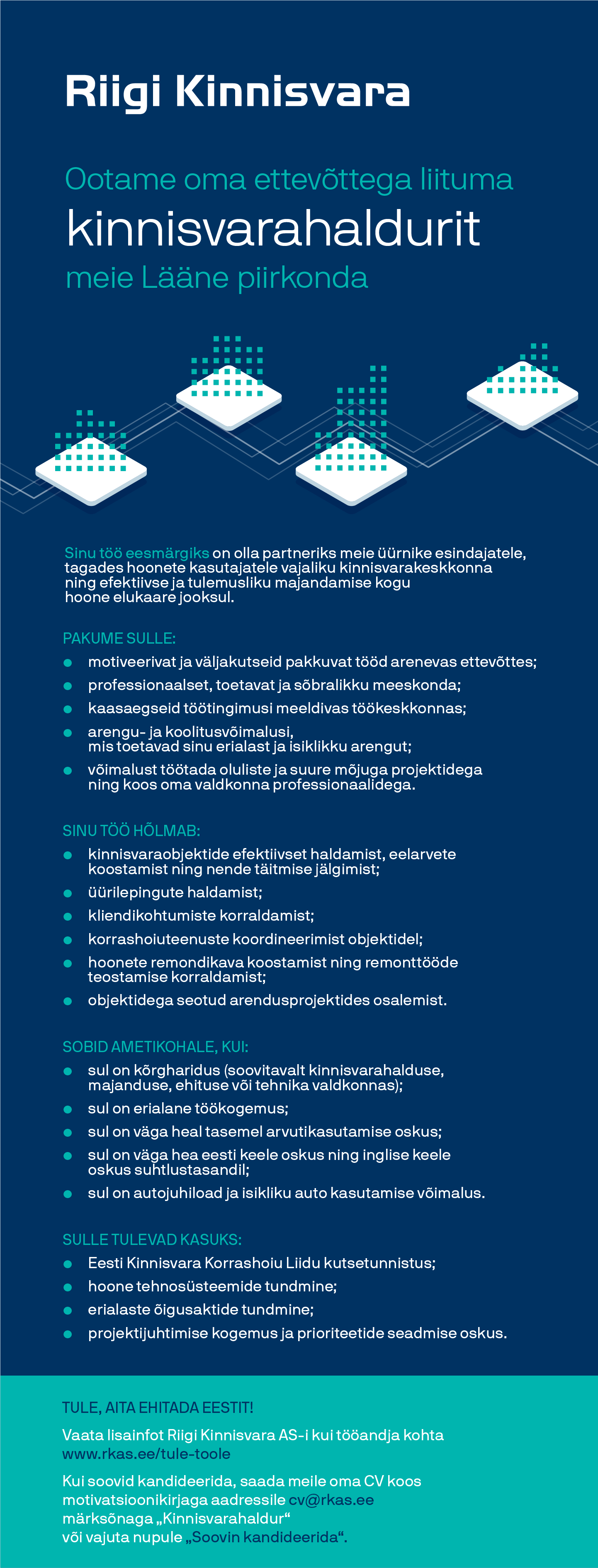 Riigi Kinnisvara AS on 2001. aastal riigi kinnisvara tõhusaks haldamiseks loodud kinnisvaraarenduse ja -halduse ettevõte, mis kuulub 100% Eesti Vabariigile. Pakume teenuseid peamiselt riigiasutustele ja avalike teenuste pakkujatele. Tallinnas, Tartus, Pärnus ja Jõhvis asuvates kontorites töötab üle 200 inimese.