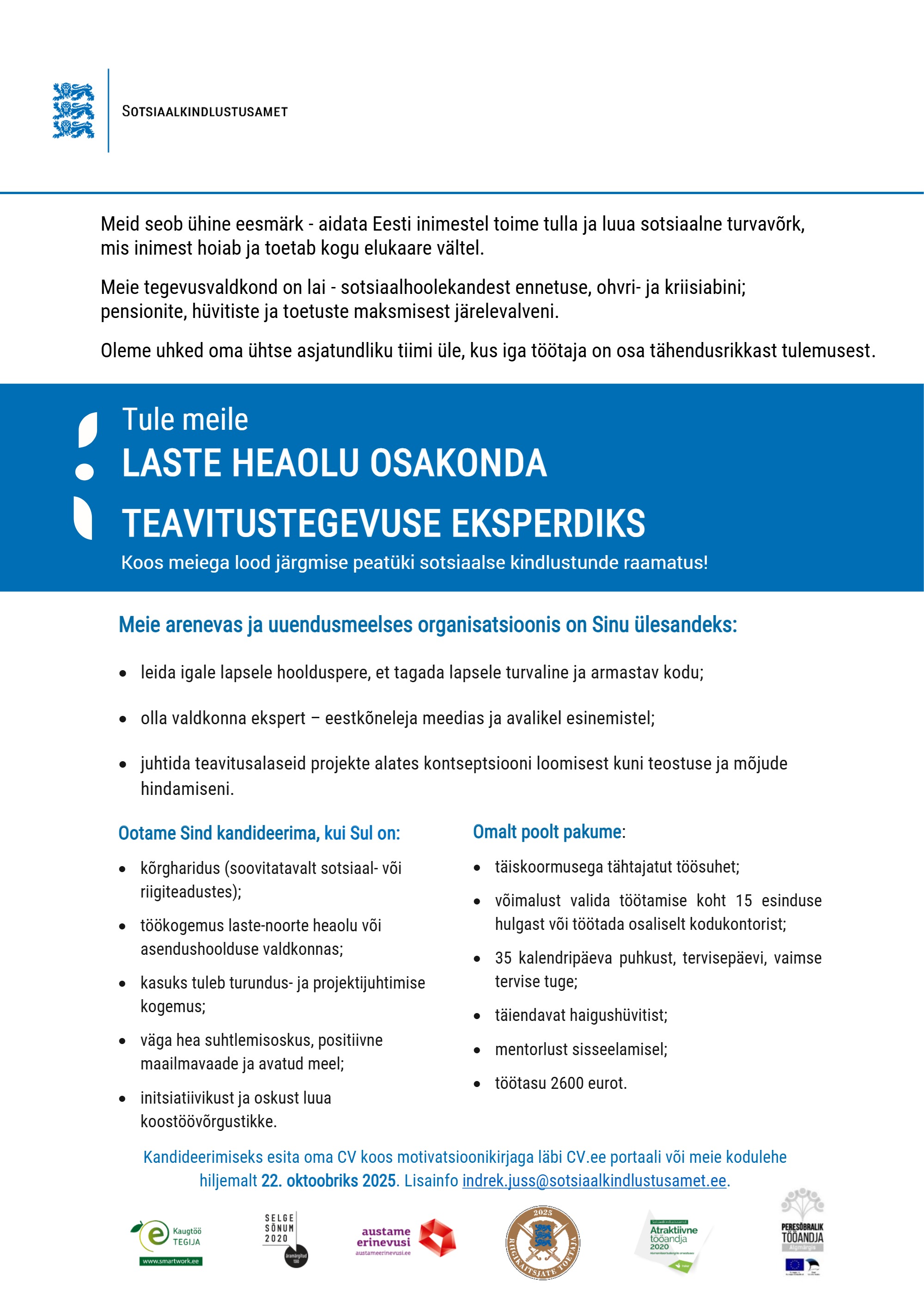 Дополнительная информация: 35 kalendripäeva puhkust, 3 tervisepäeva, vaimse tervise tugi, täiendav haigushüvitis, mentorlus