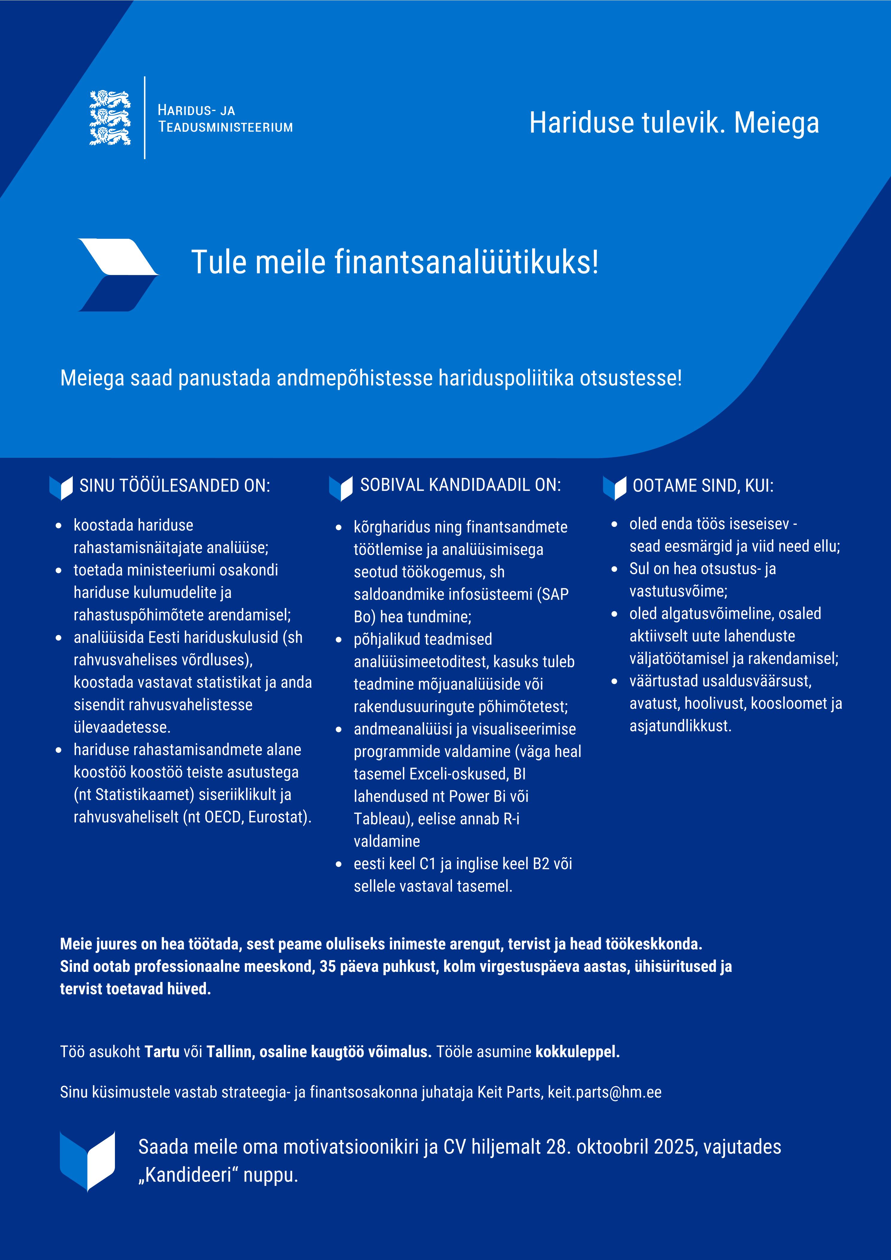Haridus- ja Teadusministeeriumi peamiseks ülesandeks on tagada haridus-, teadus-, noorte- ja keelepoliitika sihipärane ja tõhus areng ning teadus- ja arendustegevuse kõrge tase ja konkurentsivõime.