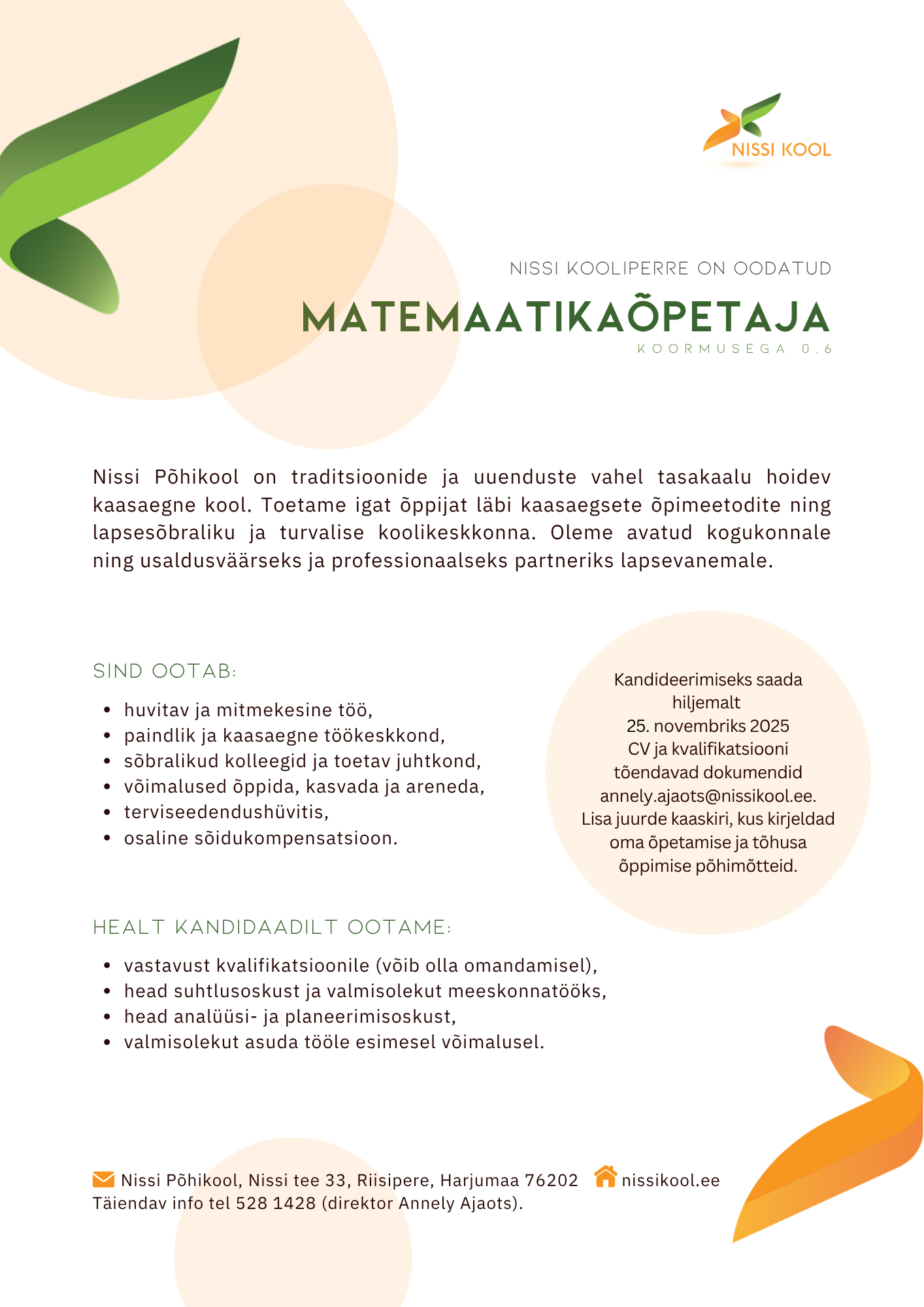 Nissi Põhikool on väike, armas, kaasaegse õpikeskkonnaga maakool Saue vallas Lääne-Harjumaal. Asume õdusas looduskeskkonnas ning meil on hea ja kiire rongiühendus Tallinnaga.