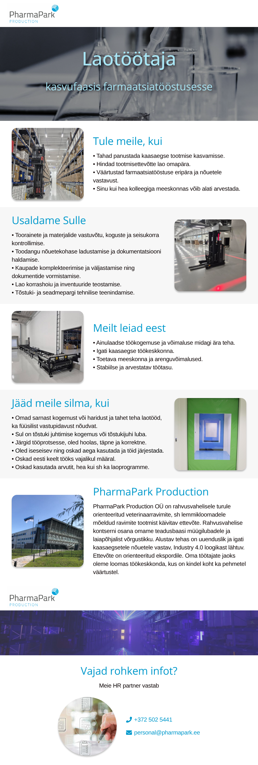 Pharmapark Production OÜ on rahvusvahelisele turule orienteeritud veterinaarravimite, sh lemmikloomadele mõeldud ravimite tootmist käivitav ettevõte. Rahvusvahelise kontserni osana omame teadusbaasi müügilubadele ja laiapõhjalist võrgustikku. Kasvufaasis tehas on uuenduslik ja igati kaasaegsetele nõuetele vastav, Industry 4.0 loogikast lähtuv. Ettevõte on orienteeritud ekspordile. Oma töötajate jaoks oleme loomas töökeskkonda, kus on kindel koht ka pehmetel väärtustel.