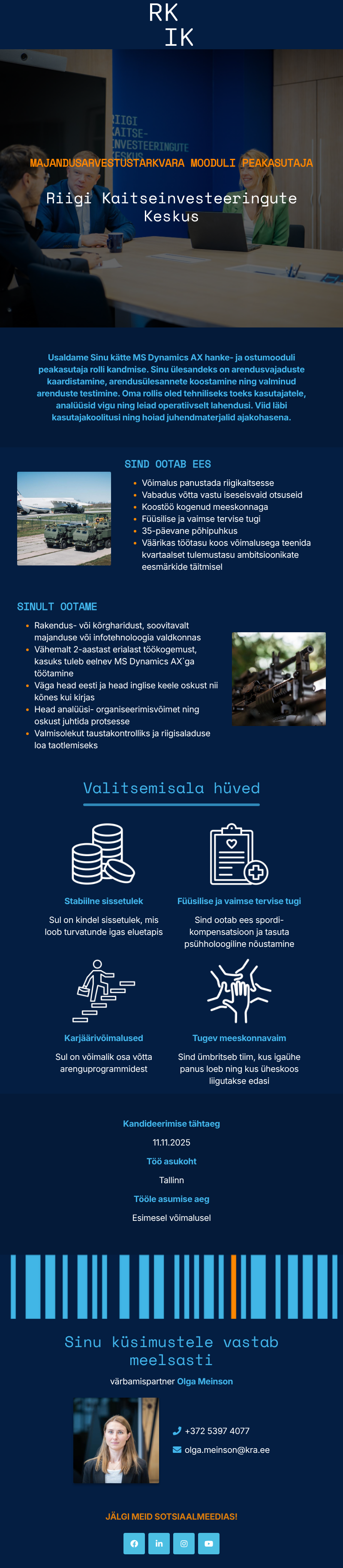 RKIK – Riigi Kaitseinvesteeringute Keskus – on kaitseministeeriumi valitsemisala keskne hankija, kes vastutab materjalide ja teenuste kättesaadavuse eest ning tagab riigikaitseks vajaliku toimiva ja ohutu taristu. Meie eesmärk on võimaldada riigikaitsetega tegelevatel organisatsioonidel keskenduda oma põhitegevustele, vähendades nende halduskoormust ja tagades Eesti kaitsevõime maksimaalselt efektiivse arengu. Meie kollektiivi kuuluvad oma valdkondade tipptasemel insenerid, spetsialistid ja juhid, kokad ja abikokad, kes tagavad enda oskuste ja teadmistega kaitsevaldkonna kiire ning efektiivse varustatuse ja arengu.