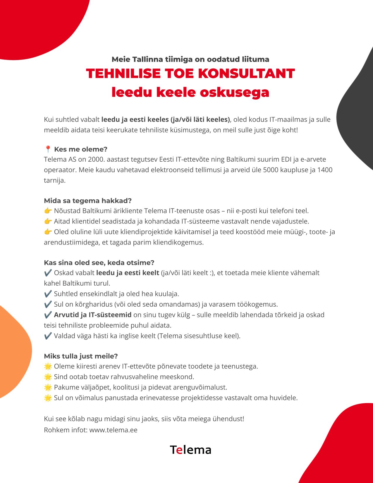 Telema is the leading EDI and e-invoicing operator in the Baltics, offering IT solutions for automated data flow in supply chain. Telema transfers, converts, monitors and processes electronic trade documents such as orders, invoices, despatch advices and other commercial documents. There are over 4400 shops and over 1200 suppliers using Telema network. Annually more than 16 million documents are exchanged. Majority of Telema clients are from the Baltic States, but also from Sweden, Finland, Poland, Denmark, Germany, Japan and Australia, ...