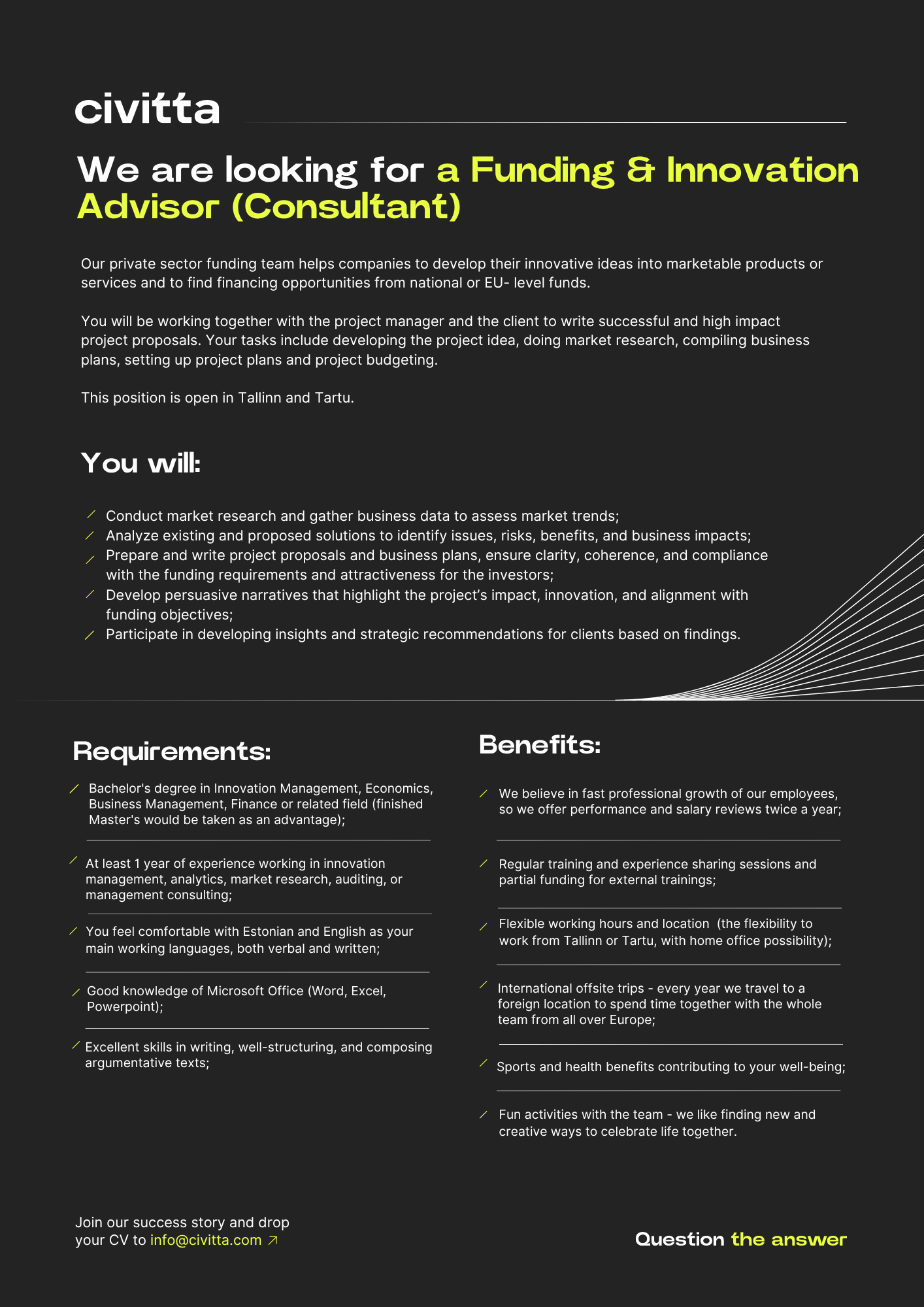 Our team spans the globe from Stockholm to Tashkent, covering Tallinn, Vilnius, Warsaw, Kyiv, Yerevan, and many more cities. Its this diversity of skills, experiences, and perspectives that drives our success. No matter where we are, were one international team, united by collaboration, openness, and a shared drive to challenge the ordinary.Ready to start your adventure with Civitta? 🚀 Check out our career opportunities and take the first step toward your journey with us.