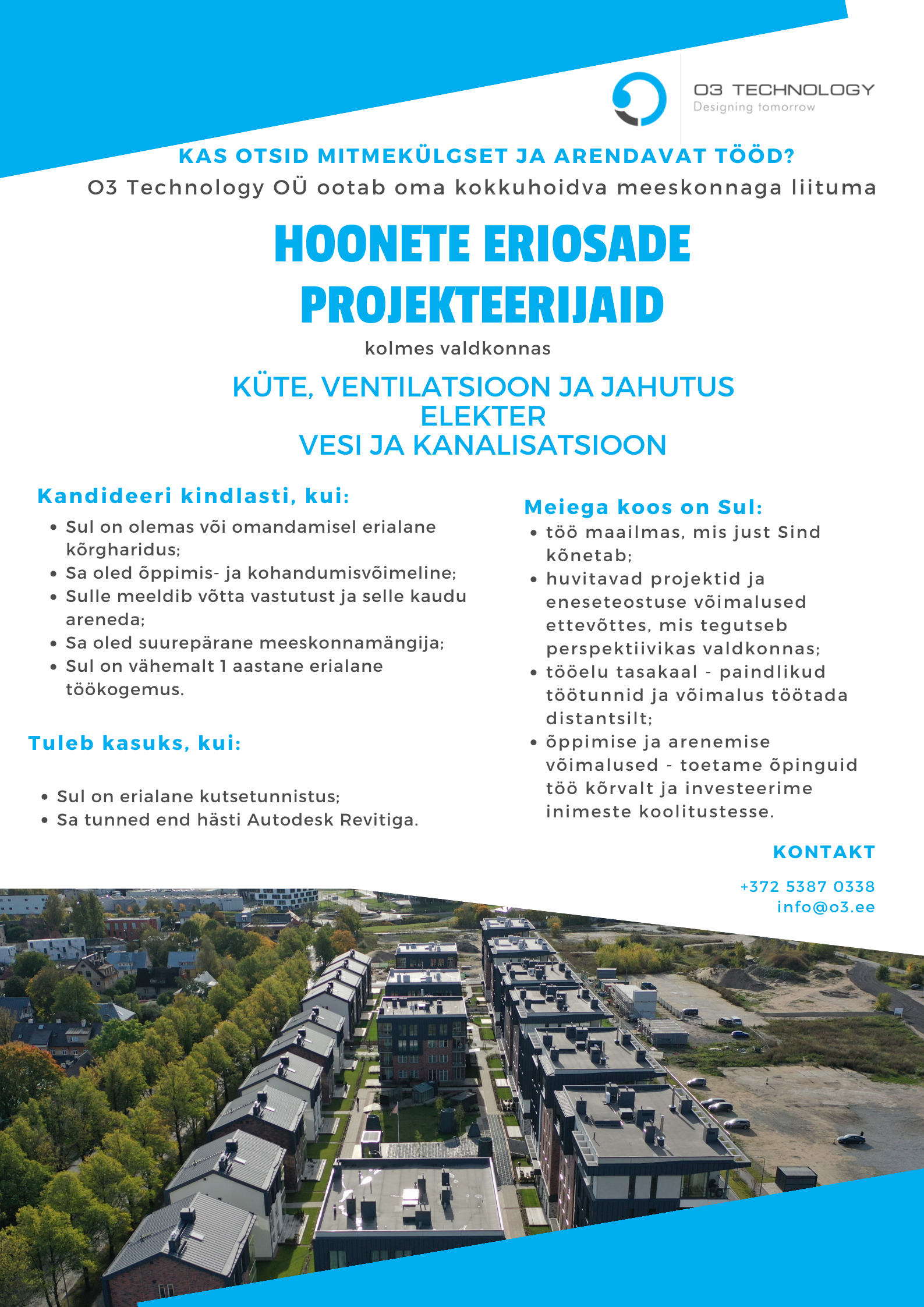 O3 Technology OÜ on hoonete eriosade ehk küte, jahutus, ventilatsioon (KVJ), vesi, kanalisatsioon (VK), gaasivarustus (GV), tugevvool (EL), nõrkvool (EN), automaatika (EA) ja energiatõhusus (EE) ja selle juurde kuuluvate kinnistusiseste välistrasside projekteerimisega tegelev ettevõtte. O3 mõtleb läbi ja mudeldab enne hoone ehitamist, kuhu ja millised tehnosüsteemid kavandatakse, et tagatud oleks parim võimalik lahendus sh sisekliima, sanitaarsüsteemid, elektri- ja tuleohutus ning kasutusmugavus hoone kasutajale.