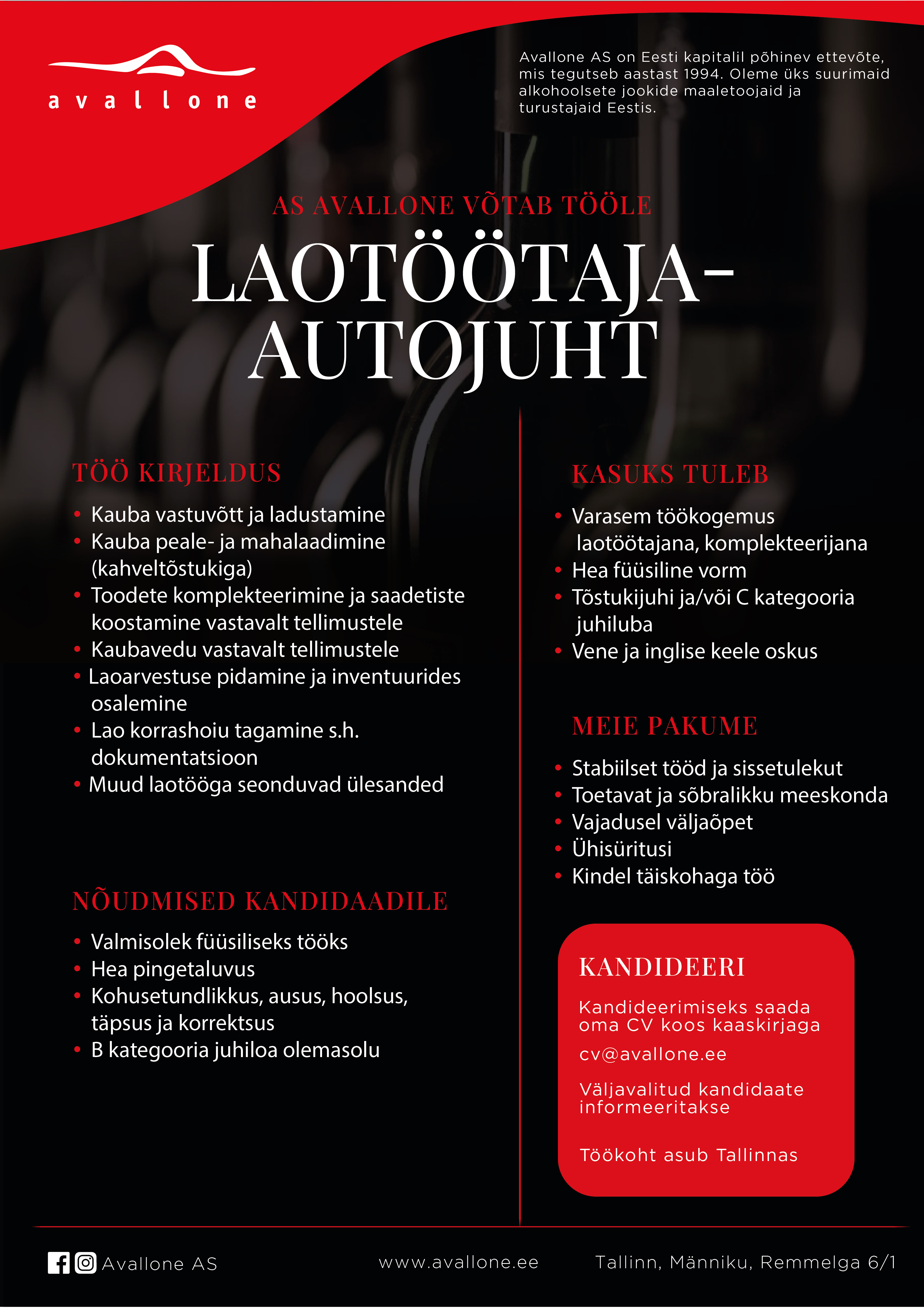 Avallone on Eesti üks suuremaid jookide maaletoojaid ja hulgimüüjaid. 1994. aastal asutatud ja 100% eraomanduses Eesti kapitalil põhinev ettevõte. Oleme spetsialiseerunud iga kliendi ja tarbija jaoks tuntud kaubamärkide esindamisele ja turundamisele koos hea kliendisuhtega. Oleme pühendunud oma klientidele üle kogu Eesti. Meie klientideks on jaemüüjad, Cash&Carry, toitlustusettevõtted, restoranid, baarid, ööklubid ja hotellid. Meie portfellis on tuntud kaubamärgid ja tooted üle kogu maailma.