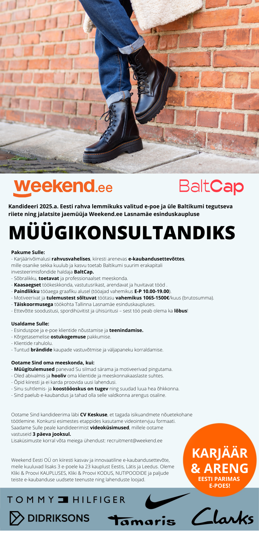Weekend on kiiresti kasvav moe- ja jalatsikaubanduse ettevõte Baltikumis. Ühendame tavakaupluste keti ning e-kaubanduse tänu meie Kliki ja Proovi teenusele ning teeme ostlemise kiireks, mugavaks ja nauditavaks. Kui sind innustavad kaasaegsed tehnoloogiad ja soovid töötada dünaamilises keskkonnas koos professionaalse meeskonnaga, siis Weekend on õige koht, kus kasvada ja areneda.