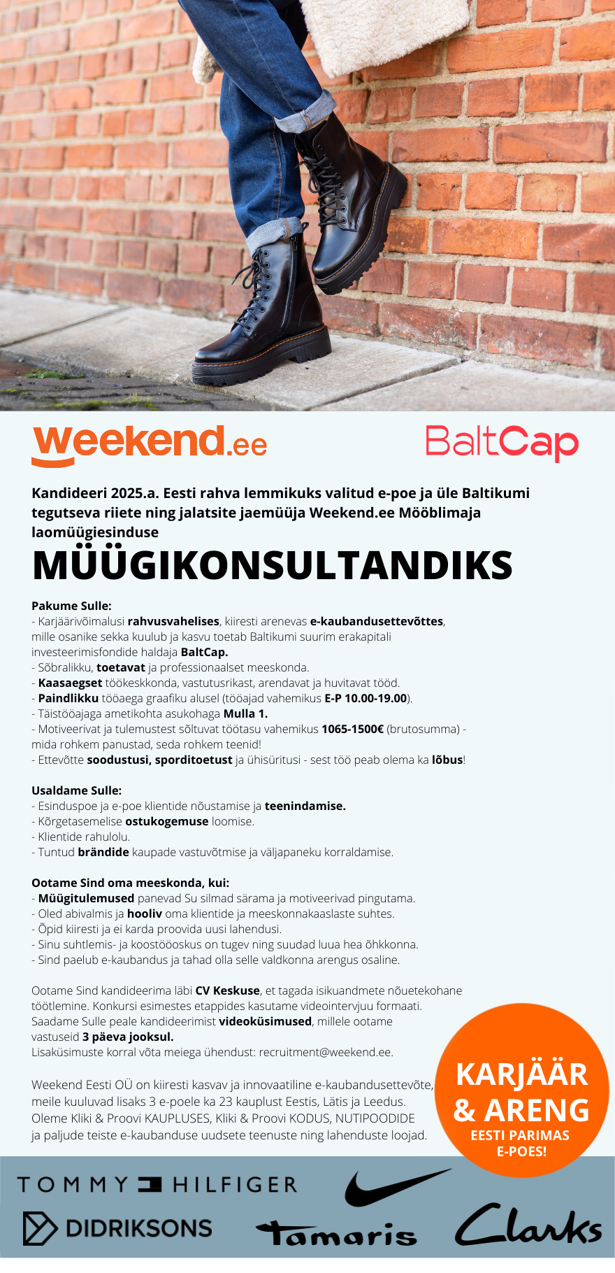 Weekend on kiiresti kasvav moe- ja jalatsikaubanduse ettevõte Baltikumis. Ühendame tavakaupluste keti ning e-kaubanduse tänu meie Kliki ja Proovi teenusele ning teeme ostlemise kiireks, mugavaks ja nauditavaks. Kui sind innustavad kaasaegsed tehnoloogiad ja soovid töötada dünaamilises keskkonnas koos professionaalse meeskonnaga, siis Weekend on õige koht, kus kasvada ja areneda.