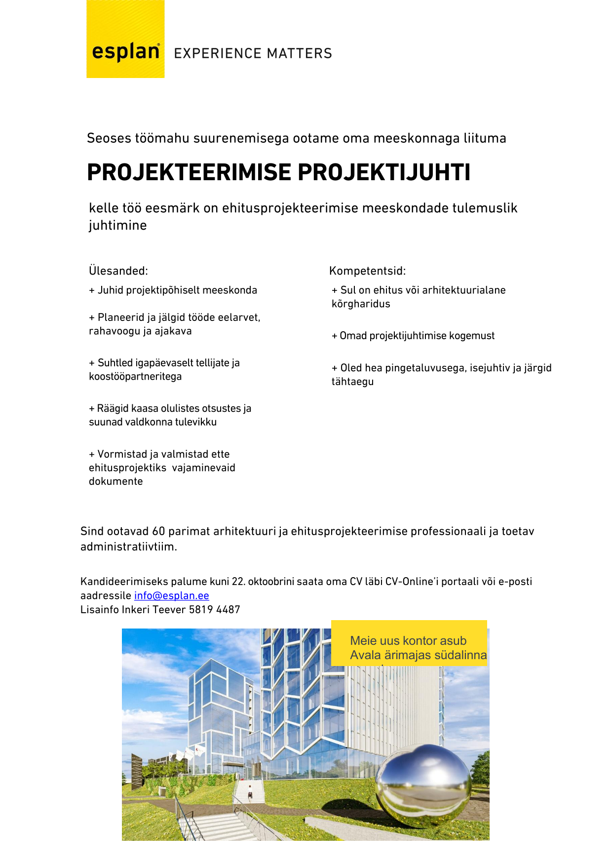 36 aastat tegutsenud Eesti juhtiv professionaalseid projekteerimise teenuseid osutav ettevõte Esplan pakub tulevikule suunatud jätkusuutlikke lahendusi büroode, korterelamute, ühiskondlike hoonete, hotellide ja laohoonete ehitamiseks.Esplan grupis töötab kokku umbes 60 spetsialisti, kelle rahulolu tagamine ning tõstmine on ettevõtte üks olulisematest eesmärkidest.