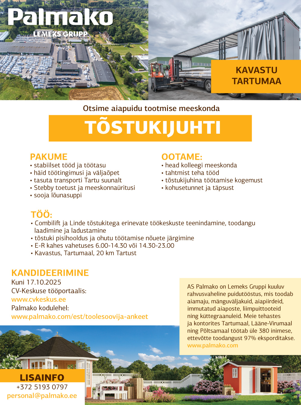 AS Palmako on Lemeks Gruppi kuuluv rahvusvaheline puidutööstus, mis toodab aiamaju, mänguväljakuid, aiapiirdeid, immutatud aiaposte, liimpuittooteid ning küttegraanuleid. Meie tehastes ja kontorites Tartumaal, Lääne-Virumaal ning Põltsamaal töötab üle 380 inimese, ettevõtte toodangust 97% eksporditakse.www.palmako.com