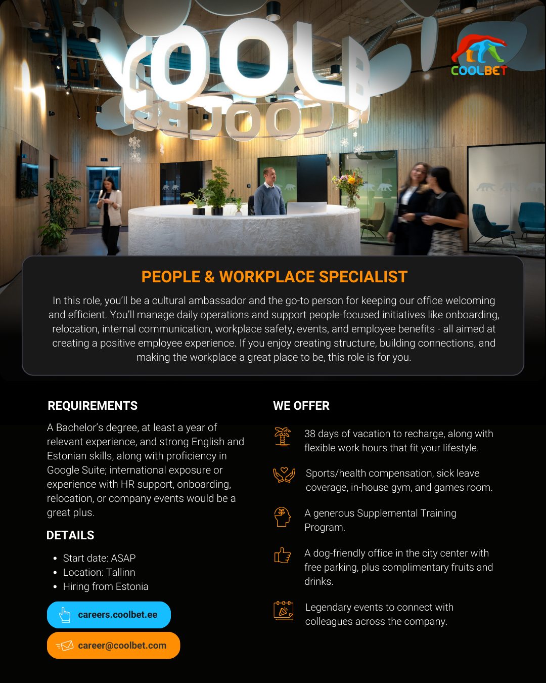 In this role, you'll be a cultural ambassador and the go-to person making sure our office is a welcoming and efficient place to work. You'll oversee the daily administrative activities that keep everything running smoothly, ensuring people, information, and resources are in the right place at the right time. You'll also handle a variety of people-focused initiatives such as onboarding and relocation, internal communication, workplace safety, company and office events, and employee benefits all aimed at creating a positive experience for everyone at the company. If you enjoy creating structure, building connections, and making the workplace a great place to be, this role will be a perfect fit for you.