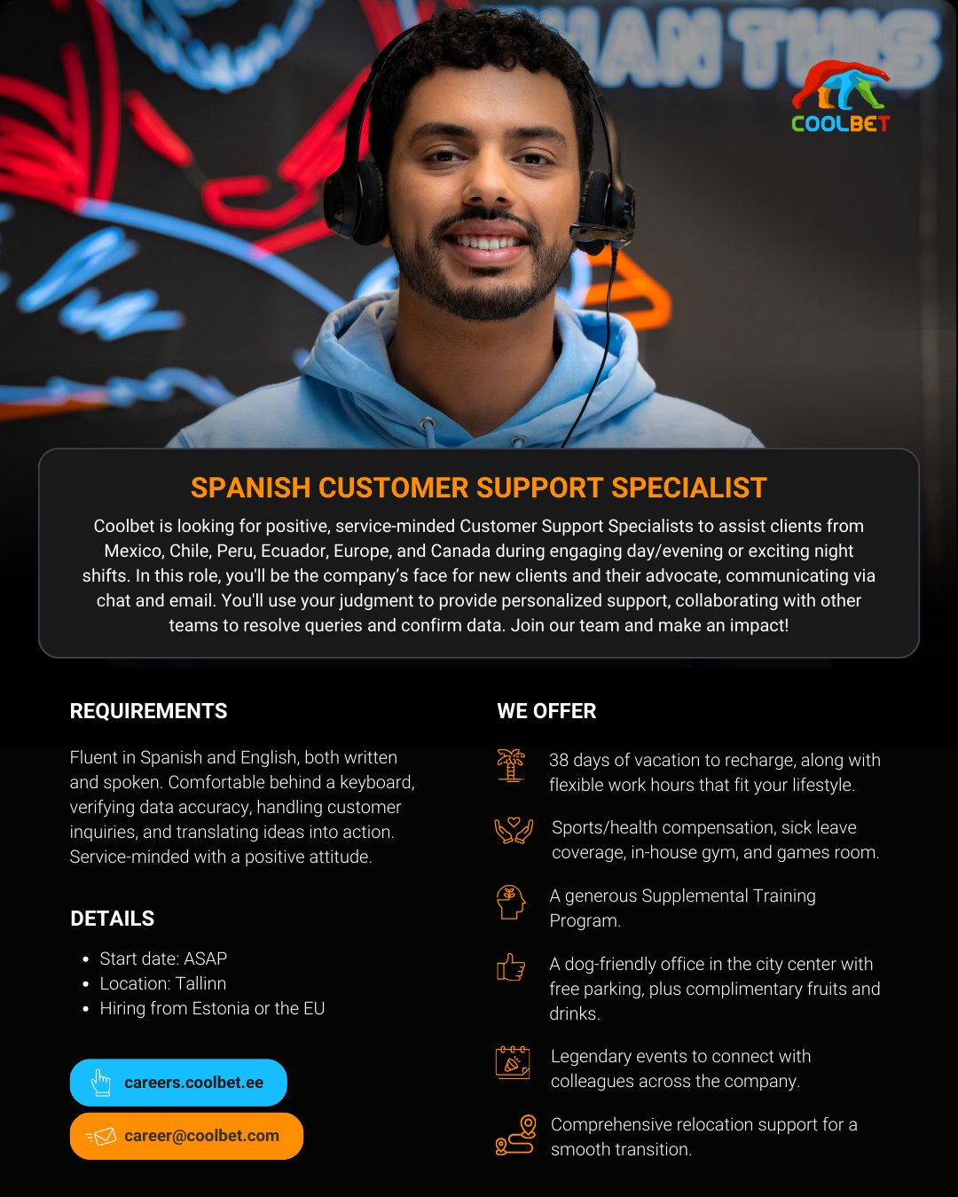 Coolbet is looking for positive, service-minded Customer Support Specialists to assist our customers from Mexico, Chile, Peru, Ecuador, Europe, and Canada during our engaging day/evening shifts or exciting night shifts. In this role, you will be the face of the company for new clients and the advocate for the customers within the company. Communication with our amazing customers is done via chat and email. You'll support their needs, using your better judgment to avoid sounding robotic. Collaborate with other departments to solve queries, confirming data from different sources. In our team, you will have the potential to learn and achieve a lot, simply by taking initiative. Join us and make a difference!